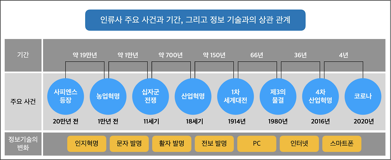 시대의 국면 전환이 이처럼 단 1년 만에 진행된 사례가 이전에도 있었을까? 사피엔스가 수렵과 채집에서 벗어나 생존의 수단으로 농경을 선택하기까지는 무려 19만 년이라는 시간이 걸렸으며, 밀의 재배로부터 시작한 농경이 전 지구로 퍼지는 데도 대략 5천 년이라는 시간이 필요했다. 18세기 부르주아 혁명으로 시작한 근대의 불씨는 11세기 십자군 전쟁을 통해 시작되었으며, 신으로부터 벗어나기 위해 절대 이성을 추구했던 인간이 두 차례의 세계 대전과 홀로코스트를 겪으며 모더니즘의 한계를 깨닫기 시작한 지는 채 100년이 되지 않는다. 이러한 시대변화의 속도는 인간의 정보 능력과 반비례한다. 즉, 정보 능력이 크면 클수록 시대 변화를 받아들이는 기간은 짧아진다. 만약 1,000년이나 100년 전에 코로나가 발발했더라도 1년 만에 세계를 장악할 수 있었을까?