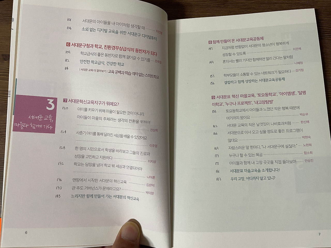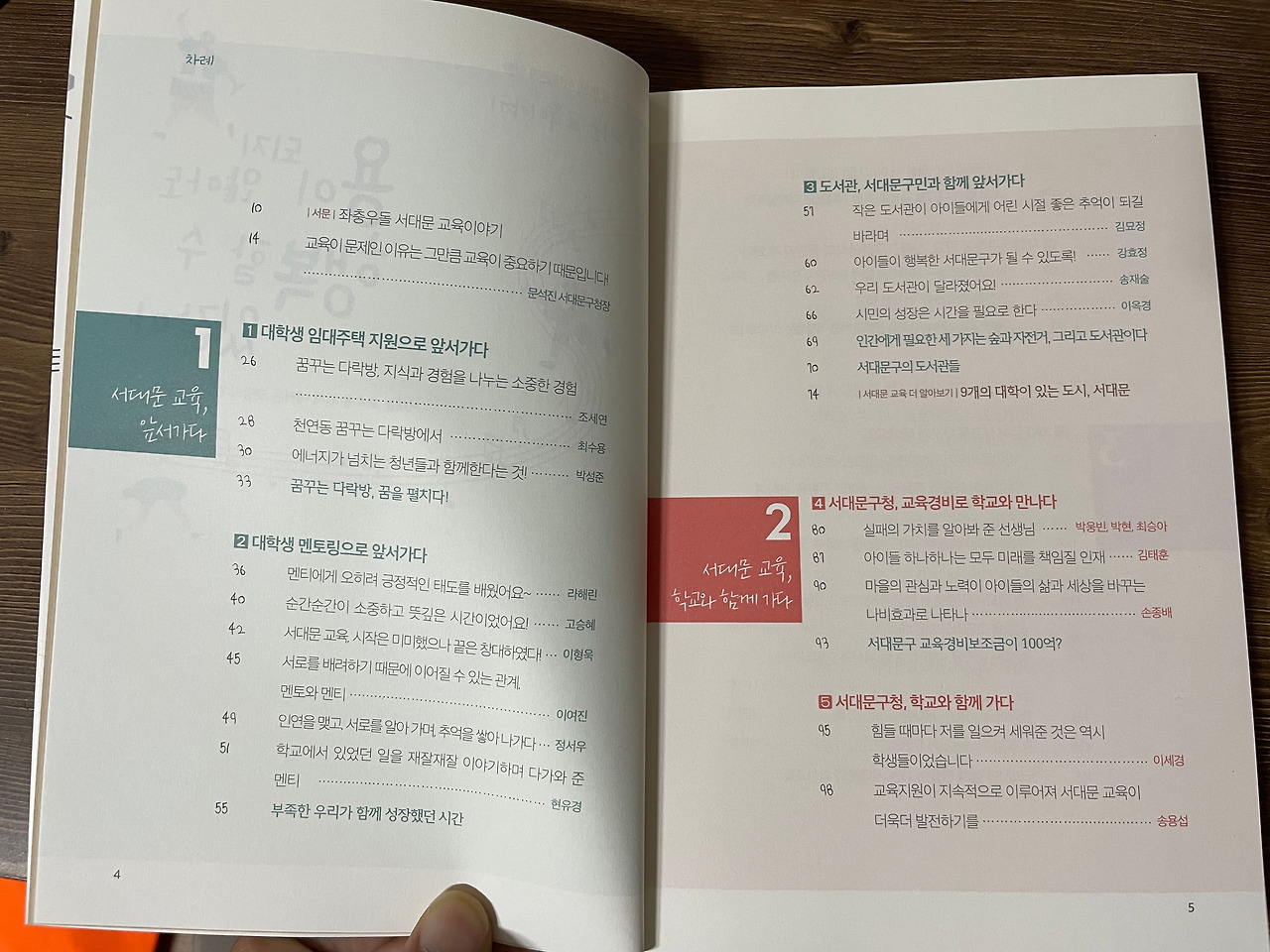 저자가 "서대문 교육을 위해 애써온 52명의 민∙관∙학이라고 되어 있다. 교육 거버넌스에 관한 책인가? 목차를 살펴보니, 5개 장, 14개 절, 52개의 토픽으로 구성되어 있다. 책을 다 들춰볼 수 없으니 일단 5개의 장 제목만 소개해 보겠다.