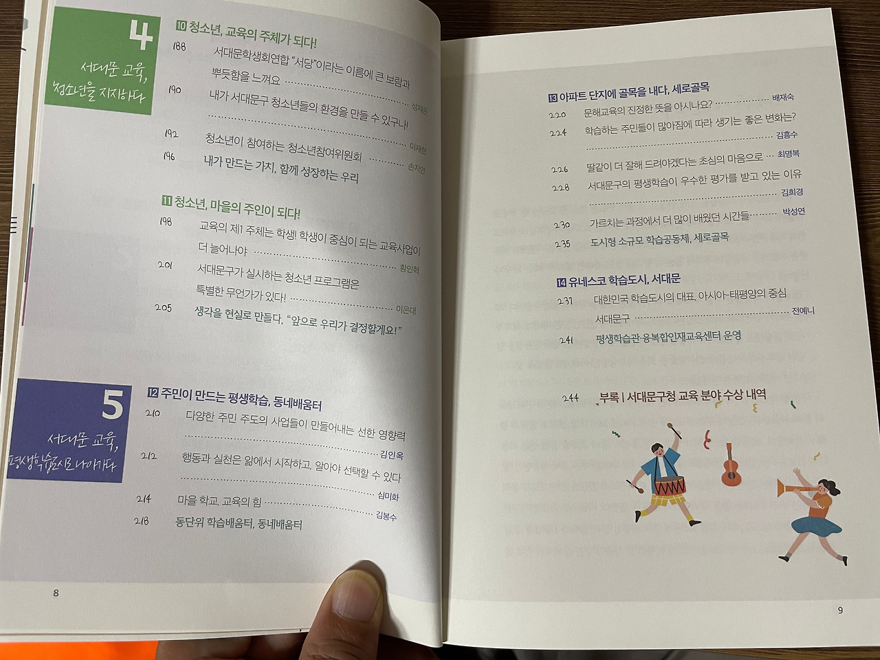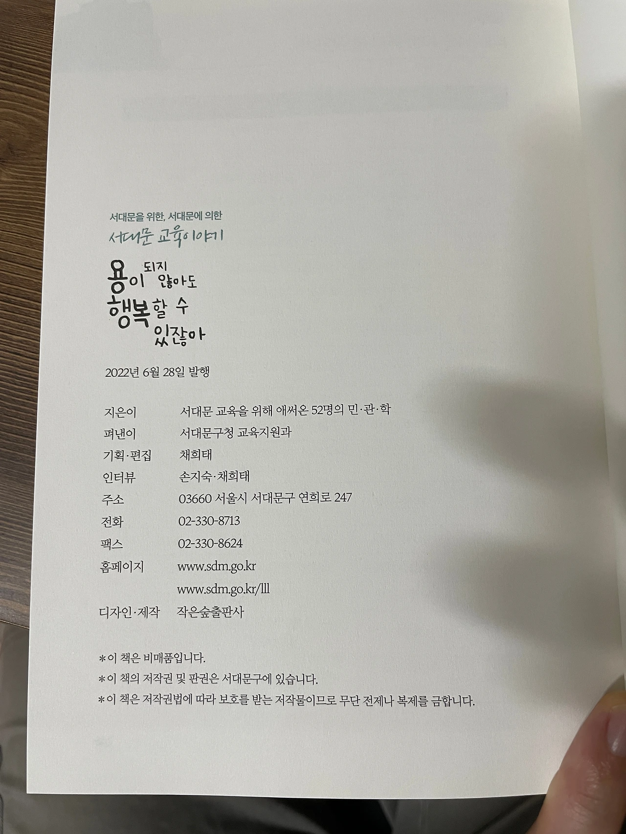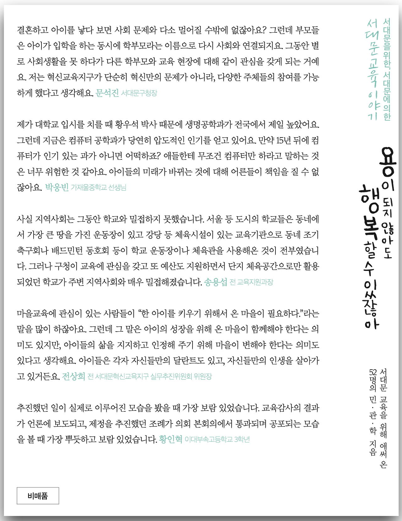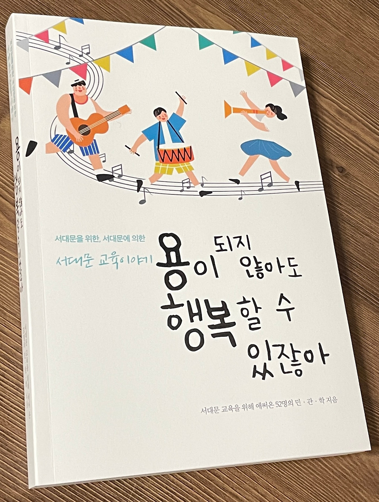 속이 꽉 찬 책이 한 권 나왔다. 저자가 무려 52명이나 된다. 돈이 있다고 구할 수 있는 책이 아니지만, 구하고자 한다면 또 돈이 없어도 구할 수 있는 책이기도 하다. 한정 수량만 찍어 낸 비매품이기 때문이다. 지난 6월 28일, 서대문구청은 지난 12년 동안 펼쳐 온 다양한 교육 이야기를 한 권에 책에 담아 펴냈다. 제목은 『용이 되지 않아도 행복할 수 있잖아』. 제목에서 교육에 대한 다소 발칙한 도발이 느껴진다. 아니, 더럽고 냄새나는 개천에서 탈출하려면 기를 쓰고 용이 되기 위해 노력해야지, 용이 되지 않아도 행복할 수 있다니!!! 이게 말인가, 막걸리인가! 도대체 어떤 책인지 궁금하니 표지와 목차를 먼저 살펴보자.