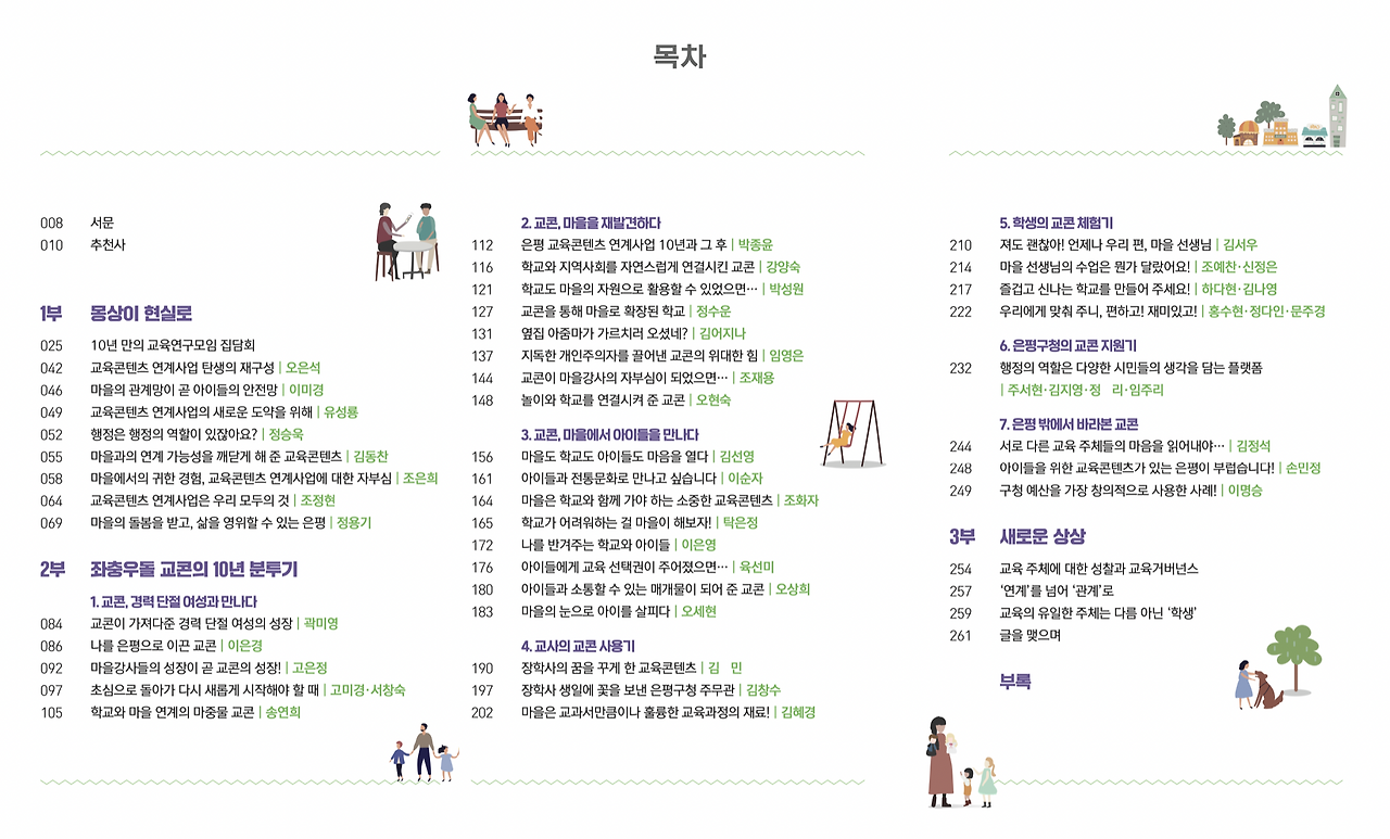 타짜에 나왔던 아귀처럼 혓바닥이 길어지면 험한 꼴을 당할 수도 있으니 말을 아끼고 본격적으로 책 소개를 해 보도록 하겠다. 제목은 <마을, 교육, 그리고 공동체>, 부제는 "은평 교육콘텐츠 연계사업 10년의 기록"으로 잡았다. 누가? 내가! 사례집에 참여한 저자는 "교육콘텐츠 연계사업과 함께 해 온 50명의 민관학"이다. 책의 꼴을 기획하는 것도 쉽지 않았지만, 50명 가까운 저자들과 만나 인터뷰하고 내용을 정리하는 것이 정말 만만치 않았다. 다음은 목차를 살펴보자. 목차만 봐도 읽고 싶은 마음이 차 오르지 않는가?