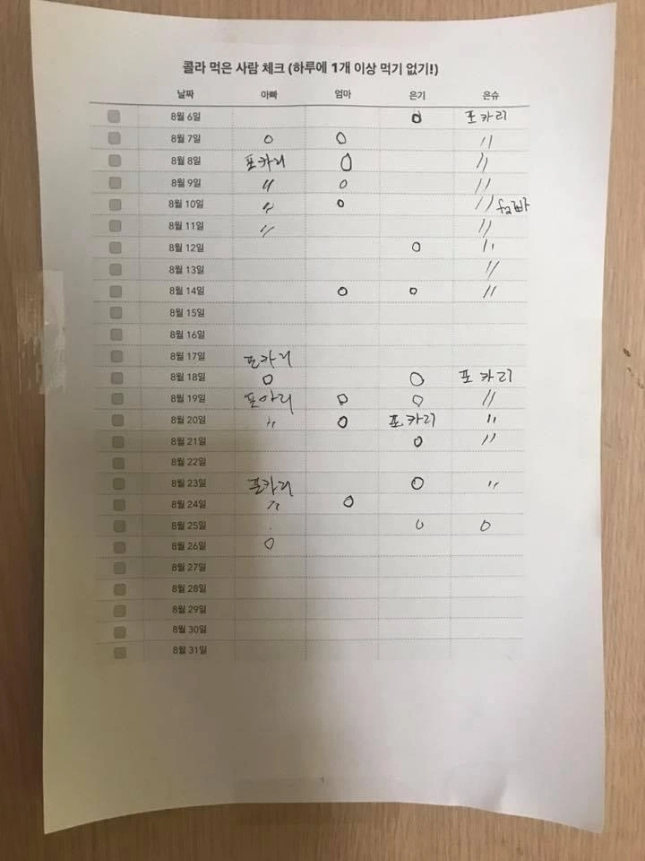 난 사진과 같이 표를 만들어 주방 벽에 붙였다. 그걸 보고 큰딸 왈, "아빠, 쓸 데 없이 재능 낭비 하지 마!"