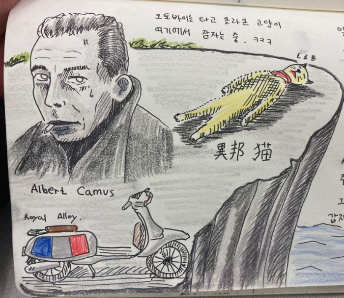 다리 짧은 고양이 한 마리가 스쿠터를 타고 절벽 위로 올라가 까뮈 옆에서 낮잠을 자는 모습을 상상합니다.