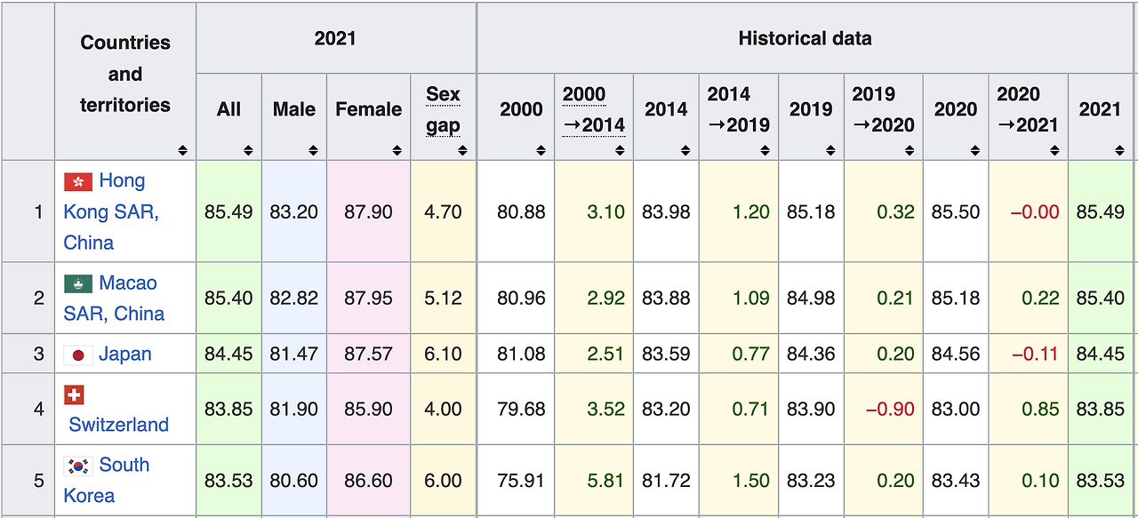 물론 "건강한 나라들"이라는 정의는 여러 가지 다른 의미가 있다. 그나마 미국이 26위를 한 이 지표는 GDP, 인구, 건강 인지도등 여러 가지를 반영한 것이고 단순하게 수명만 본다면, 미국은 59위다. 생각보다 미국은 영아 사망률도 높다. 2021년 자료로 한국이 세상에서 5번째로 오래 산다.
