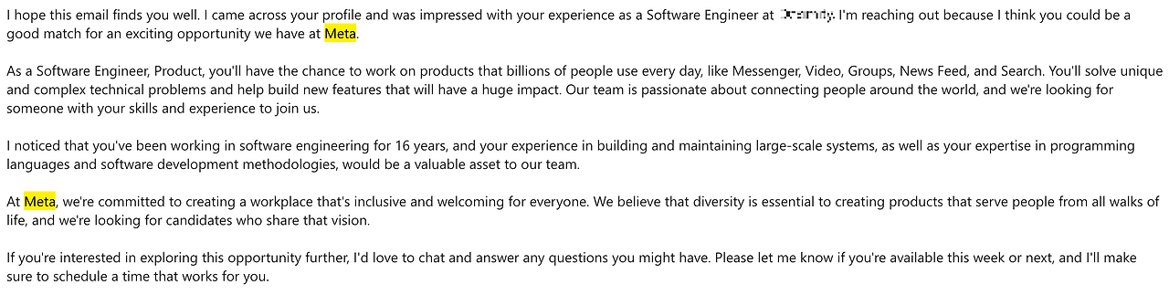 참고로 내가 받은 이메일을 밑에 첨부했다. 한 번 더 강조하지만 이런 이메일은 흔하다. 보통 큰 회사 리쿠루터들은 지원자가 많아야 입사 성공률이 높아지고, 이런 입사율에 따라 성과급을 받는 경우가 대부분이기 때문에 보통 하루에도 수백 개의 이메일을 이름만 바꿔서 무작위로 보낸다.