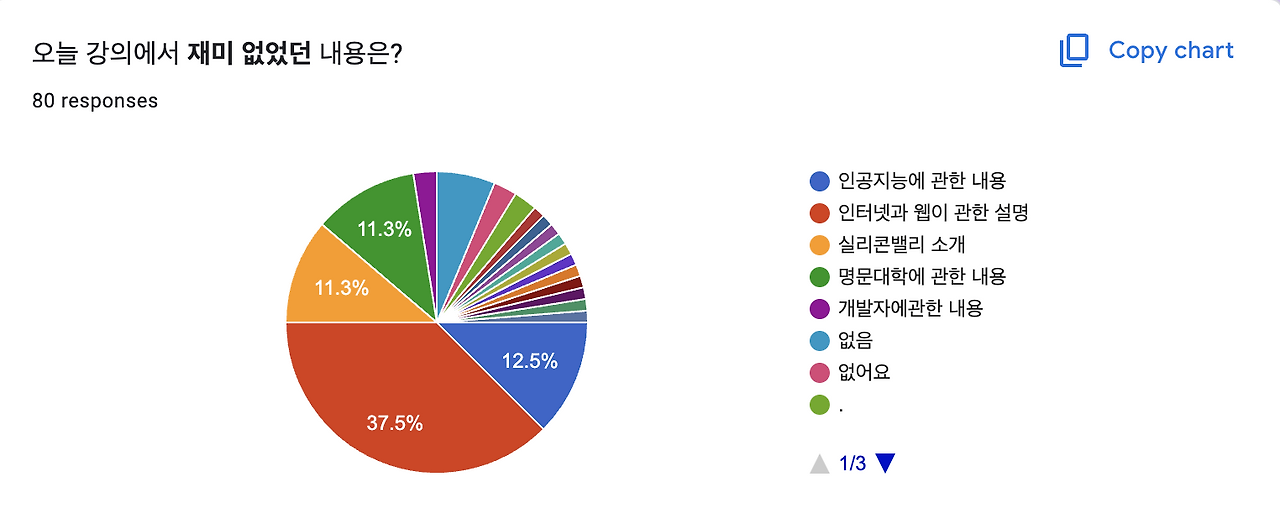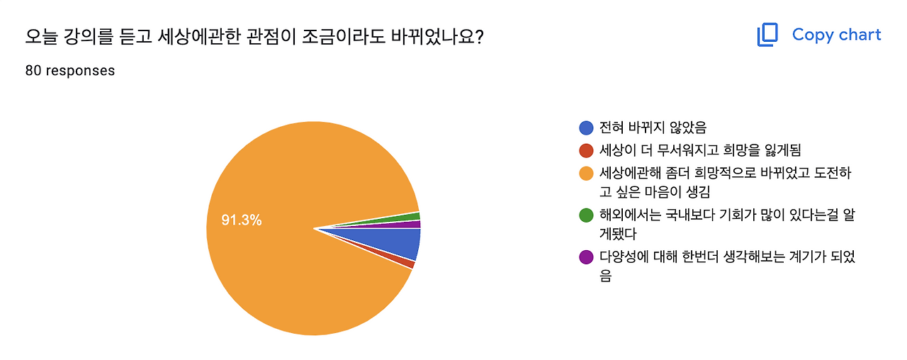 강의가 끝나고 아이들에게 강의에 대한 설문을 했는데 80여 명이나 되는 아이들이 참여해서 귀한 한마디도 써줬다. 지난주에 미국에 다시 돌아오고 출장을 가느라 시간이 없어서 열어보지 못한 이 내용을 오늘에서야 보았다. 그리고 마음이 참 따듯해졌다.