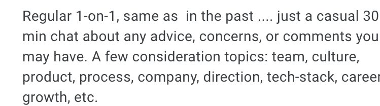 도대체 2주에 한 번씩 만나는 매니저랑은 30분 동안 무슨 얘기를 나눌까? 물론 이것도 회사마다 팀마다 다를 수 있다. 내 매니저가 나와 같은 상품팀에 일하지 않는 경우에 매니저가 내가 뭘 하는지 또는 잘하는지 알까?라는 궁금증이 들 때도 있다.