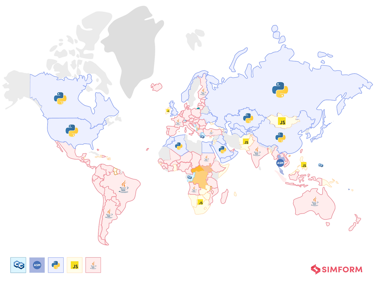 참고로 아래의 지도는 가장 많이 쓰이는 프로그램의 지역 분포도이다. 미국, 캐나다 한국을 포함한 아시아권은 Python이 가장 많이 쓰고, 호주, 아프리카와 중남미에는 Java가 아직은 많이 쓰이고 있다. 꼭 많이 쓰이는 언어를 배울 필요는 없지만, 웹 쪽으로 가고 싶은 분들은 역시 Javascript가 제일 중요하고, 다른 쪽은 Python배우시면 여려 곳에 활용도가 높다. 또 지금이나 앞으로도 계속해서 잘 나갈 기술은 역시 mobile 앱 쪽이다. iOS나 Andriod계발은 웹 개발자보다 취업도 쉽고 급여도 높다.