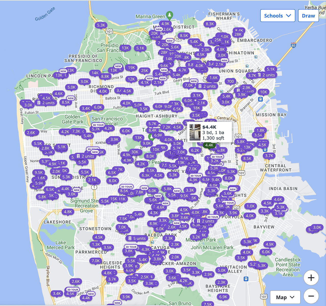 참고로 미국에는, 아니 한국 말고 어떤 나라에도 "전세"라는 개념은 없다. 전세는 한국 부동산시장만이 가지고 있는 특징이다. 밑의 참고자료는 지금 현재 월세가격이다. 이것은 방 1개짜리를 기준으로 한 것이다. 보통 3 - 4K 즉 한국돈으로 4 - 6백만 원쯤 월세로 들어간다. 나머지 다른 비용, 물, 인터넷, 가스, 전기, 쓰레기수거 비용 등이 한 $500불 정도 추가된다. 보통 미국에서 월세를 계약할 때 첫 달, 현재 달 그리고 마지막 달 렌트를 계약비로 지불한다. 그래서 처음 월세를 얻을 때에 $10K - $12K 정도가 들어간다. 한국돈으로 천 3백 - 천 6백 정도가 들어간다.