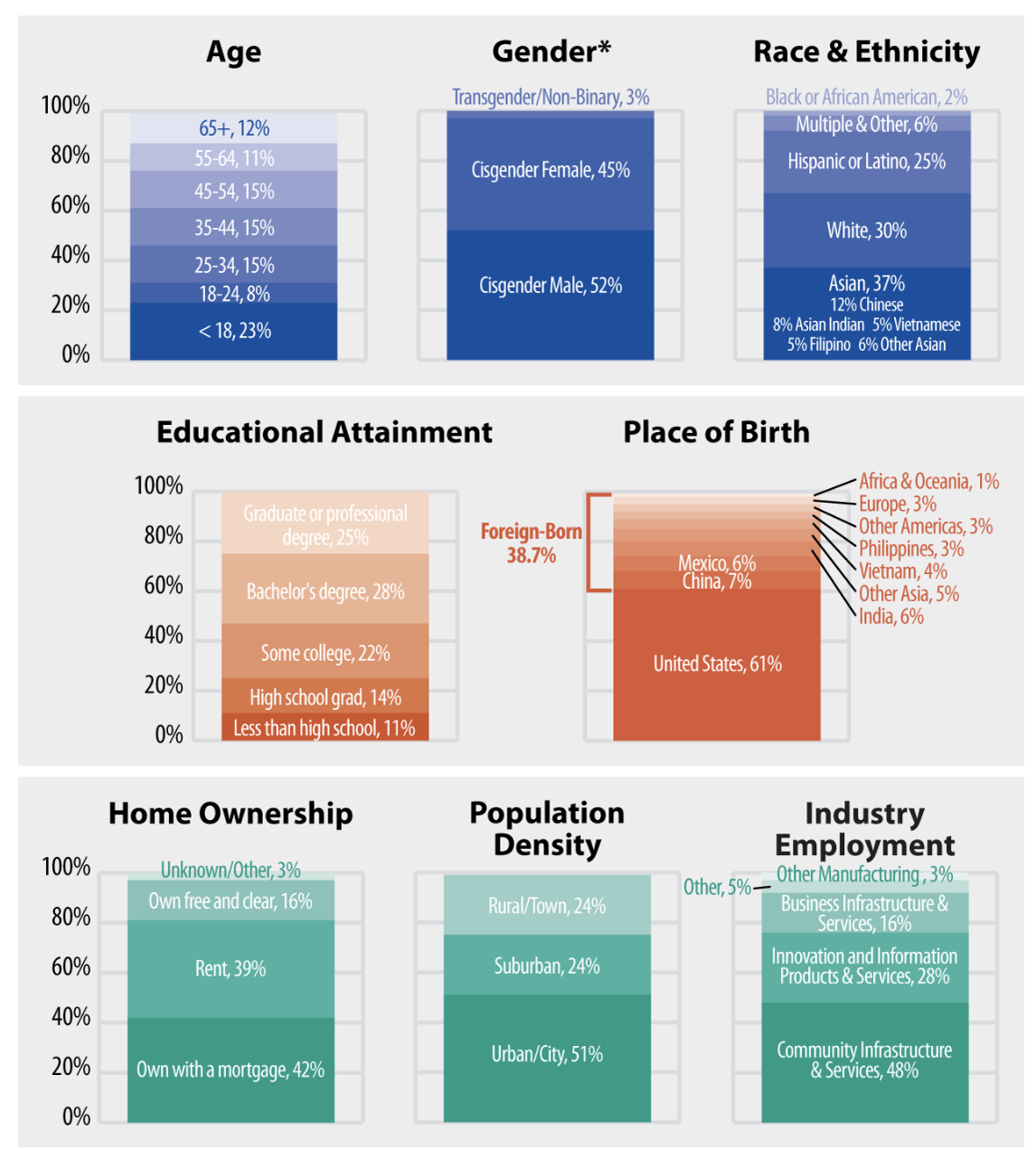 올해 들어서 처음으로 아시아인이 백인을 수를 넘어서 가장 많은 인종이 되었다. 37% vs 30%. 몇 가지 재미있는 다른 요소들은 집 보유율과 월세의 비율이다. 각 각 42% 와 39%.