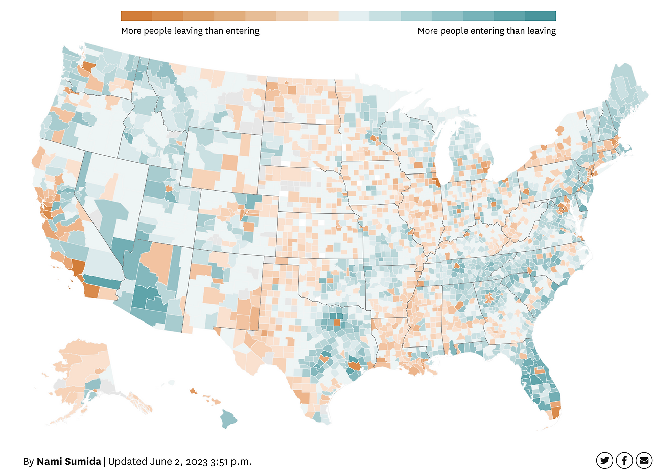TRUE. 많은 사람들이 실리콘밸리를 떠났다. 위의 사진에서 빨간색으로 갈수록 사람들이 빠져나간 것이고, 파란색이 진해질수록 유입인구가 많다는 뜻이다. 자세한 내용은 여기서 볼 수 있다.