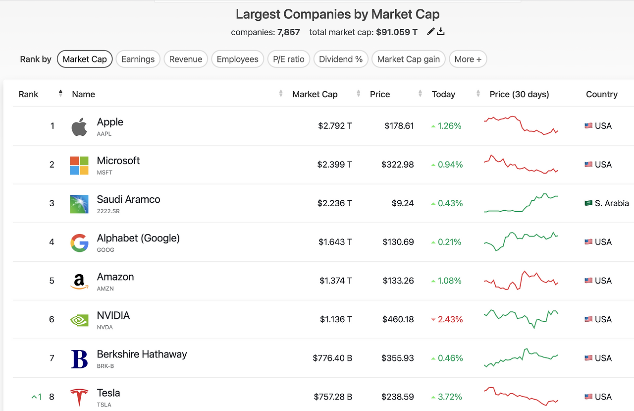 물론 모든 사람들이 세상을 바꾸는 중요한 일을 할 수도 없고, 할 필요도 없겠지만, 요즘 돈 많은 회사들이 인재를 끌어들이기 위해서 제시하고 있는 이런 각종 혜택들은 다른 일을 할 수 있고, 하고 싶어 하는 인재들을 컴퓨터 앞에 끌어 앉히는 것 같다. 또 시가총액으로 본 전 세계 가장 큰 회사들의 리스트를 보면 알겠지만, 왜 요즘 전 세계의 모든 인제들이 프로그램으로 너도 나도 뛰어드는지 짐작할 수 있을 것이다.