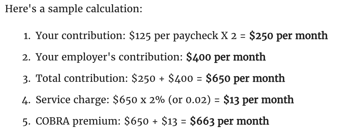 직장에 다니는 미국인들은 직장이 제공하는 의료보험에 의존한다. 그래서 직장을 잃으면 가장 큰 문제는 의료보험의 상실이다. 내가 또는 내 가족이 병이 있으면, 예로 당료나 고지혈처럼 항상 처방전이 필요한 약을 복용하는 경우에는 큰돈이 들어간다. 우선 연방법으로 퇴직 후 받는 의료보험을 Continuation of Health Coverage, 줄여서 COBRA라고 하고, 이는 20명 이상의 사업자에서 적용된다. 직장 의료보험의 경우 회사가 보험료의 60 - 100%를 내준다. 밑에 보이는 예는, 만약에 회사에서 한 달에 $400불씩, 내가 $250을 냈던 경우에 한 달에 내야 되는 COBRA 금액이다. 한 달에 $663, 한국돈으로 약 88만 원을 매 달 내야 한다. 참고로, 이것은 기본적인 수준의 보험이다. 실리콘밸리에서의 COBRA는 보통 $2,000 - $3,000 정도. 한화 300 - 400만 원 선이다. 그만큼 실리콘밸리 회사들은 프리미엄 의료보험을 제공하고, 회사가 내는 부담금도 거의 90% 이상이다. 퇴직을 한 경우에 COBRA는 제직당시의 의료보험만을 보장함으로 갑자기 회사에서 90%씩 내주던 보험료를 내가 부담해야 하는 일이 생긴다. 그래서 당장 퇴직하면 수입도 없는데 의료보험이 한 달에 300 - 400만 원 정도 나간다. 그래서 미국 사람들은 섣불리 퇴직을 할 수 도 없고, 해고를 당하면 망막함이 더 크게 온다.