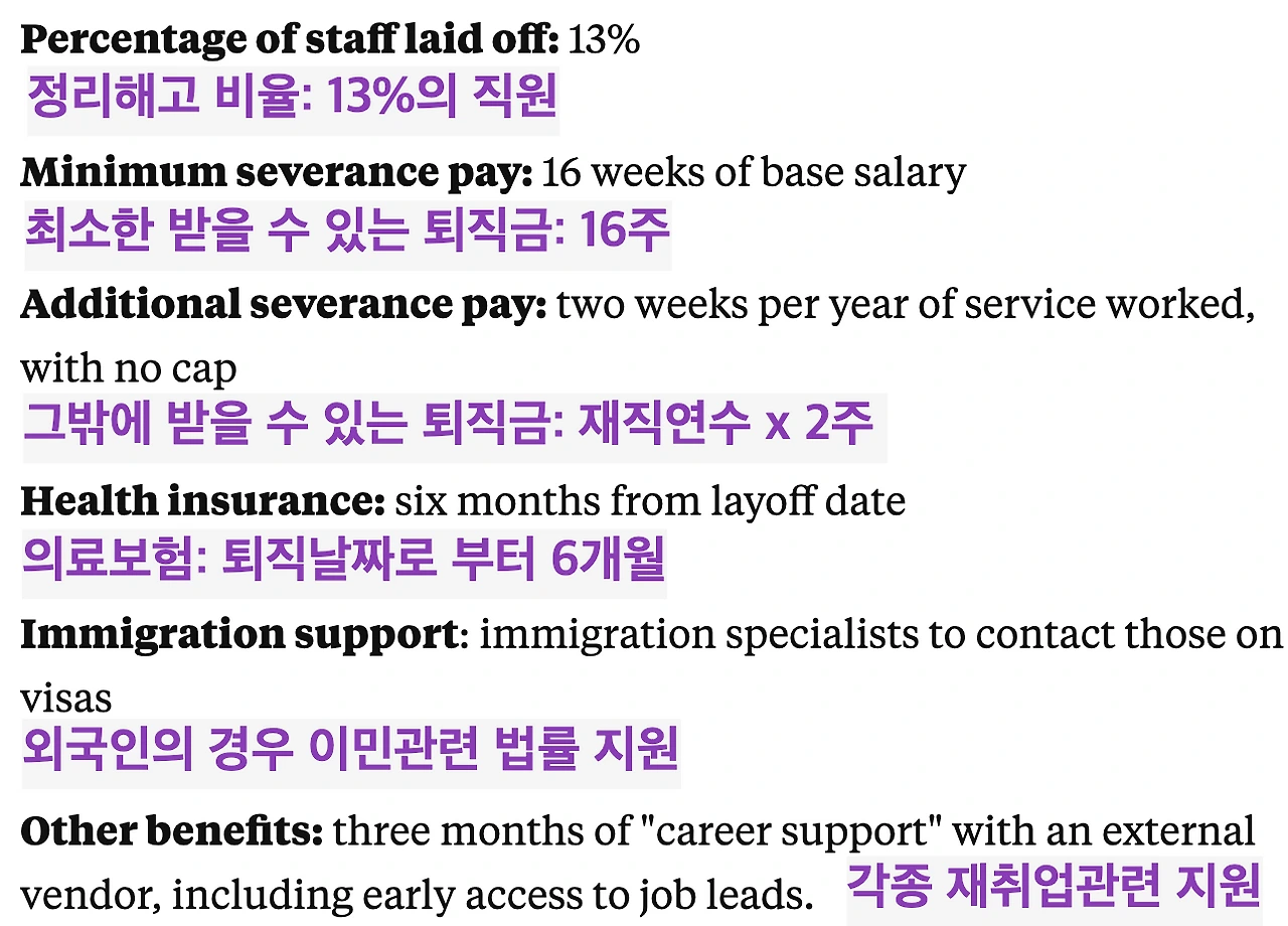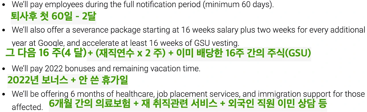 회사들이 유행처럼 많이 정리해고를 하고 보니 정리해고를 당하고 받은 Severance Package, 즉 해고 퇴직금 및 혜택에 많은 관심이 모였다. 일부 큰 회사들은 공식적으로 해고 퇴직금의 세부사항을 밝힌 곳도 있다. 밑의 자료는 구글 CEO의 2023년 1월 일자 발표에서 가져온 정리해고 퇴직금과 혜택이다.