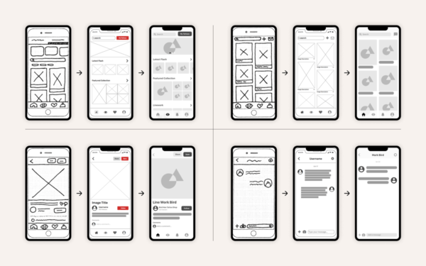 UX/UI 디자이너들과 PM(Product Manager)들이 앞서서 세운 MVP에 따라서 앱의 구성을 진지하게 시작한다. 이때 엔지니어 쪽에서도 매니저쯤이 제품구성에 참여한다. 앱의 기능들을 중심으로 페이지마다의 구성도 대략 정해진다. 이때 UX 디자이너가 다시 사용자 인터뷰, 또는 다른 비슷한 앱들을 연구하고 우리의 목적에 맞게 구성을 한다. 우리가 이런 구성도를 Wireframe이라고 한다. 한마디로 앱을 종이에 그리면 이런 모양일 것이라고 하는 기본적인 구성 체계다. 아래의 예가 바로 wireframe의 예. 요즘에는 이런 것을 잘할 수 있도록 도와주는 앱이 많아서 꼭 전문가가 아니더라도 쉽게 만들 수 있다.