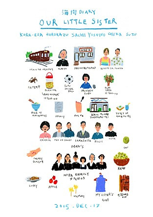고레에다 히로카즈 감독은 상처를 안고 사는 사람들을 통해 사람과의 관계를 그려냅니다. 2015년 12월 국내 개봉한 영화 <바닷마을 다이어리>도 그 맥락에서 벗어나지 않습니다. 상처받고 남겨진 세 자매에게 준비 없이 맞이한 막내 ‘스즈’는 또 하나의 가족입니다. 겉으로는 일상적인 대화나 행동을 하지만, 그것이 상처 위의 것이라는 점을 감안하면 연민을 불러일으킵니다.