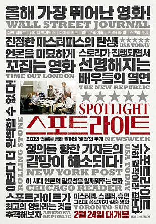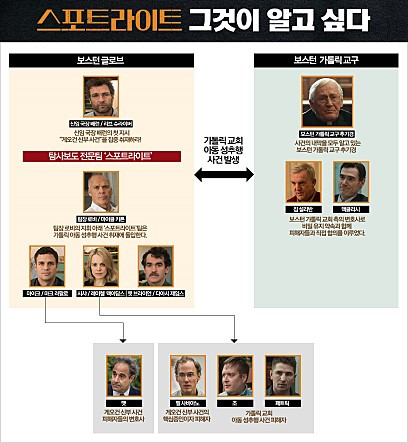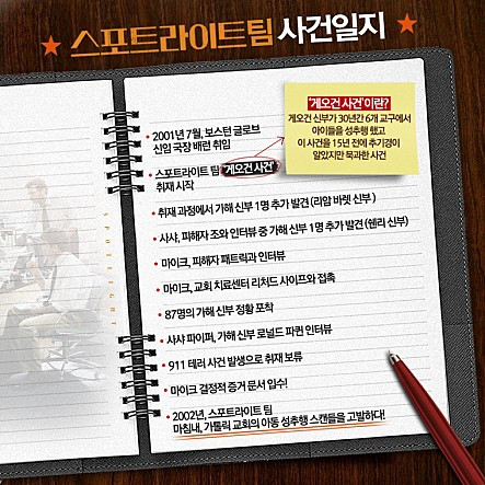이 영화는 [보스턴 글로브] 기자들의 실화를 기반으로 한 영화다. 미국의 3대 일간지 중 하나인 [보스턴 글로브]의 ‘스포트라이트’ 팀이 가톨릭 보스턴 교구 사제들의 아동 성추행 사건을 취재하며 벌어지는 과정을 다루고 있다. 실제로 이 기사를 보도했던 스포트라이트 팀은 미국에서 가장 권위 있는 상인 퓰리처 상을 수상했다.