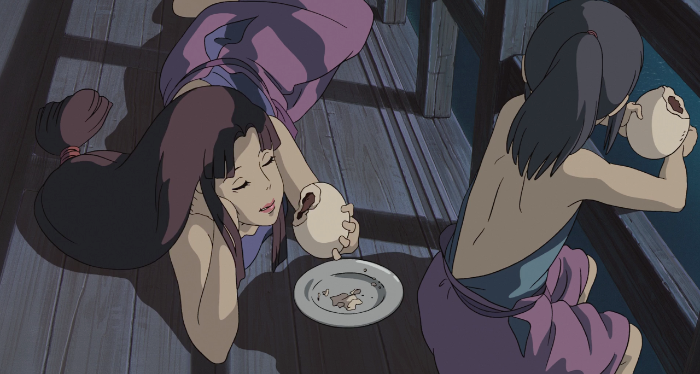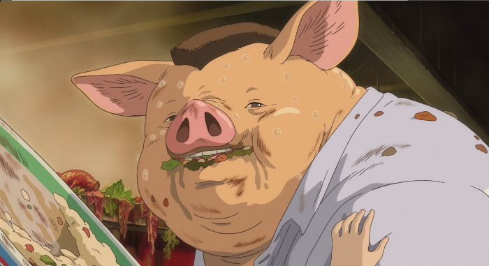 치히로가 불길한 느낌에 돌아가자고 하지만 부모님은 무언가에 홀린 듯 길을 따라가다 어느 음식점 앞에 놓인 음식을 먹기 시작한다.
