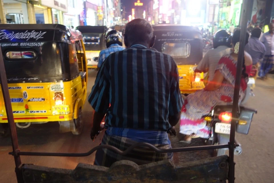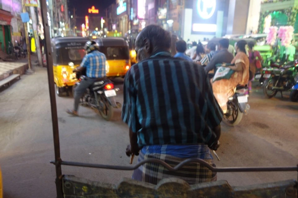 이 릭샤왈라(탈 것 운전사)를 만난 건 해가 지고 관람한 궁전의 라이트 쇼가 끝난 뒤였다. 호텔로 돌아갈 생각에 합승 오토릭샤(오토바이 택시)에 끼여 타려고 지나가는 릭샤마다 행선지를 물어봤는데 번번이 다른 길로 가는 오토릭샤만 잡히고 있었다. 그때 몸집이 작고 까만 이 늙은이가 어두움 속에서 불쑥 나타난 거였다. 그는 두 손으로 자전거 핸들을 잡는 모습을 하며 다가와 뭐라고 말을 전하려는 듯했다. 내 자전거로 데려다줄게, 하는 말로 들려 "호텔 첸투르?"라고 물으니 대번에 알았다고 눈에 힘을 주며 고개를 자신감 있게 끄덕인 후 나를 자신의 자전거로 안내했다.