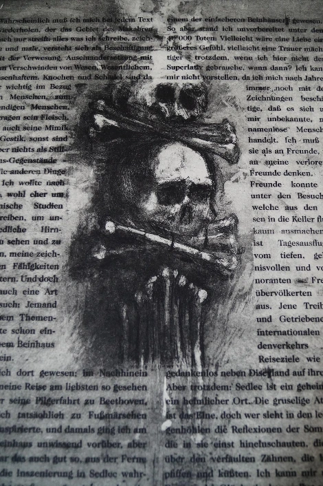 그리고, 계속 여행을 가자고 꼬셨다. 체코에 있는 성당에 대해 얘기했다. 인간의 해골과 뼈로 장식한 샹들리에, 수천개의 유골로 벽면을 채운 납골당 이야기를 자주 했다. 무어씨는 며칠씩 차가운 바닥에 앉아 엉덩이가 얼얼할때 까지 스케치를 했다. 공동묘지에 환장한 나도 해골성당에 솔깃해서, 프라하에 있을 때, 여행계획을 세웠다가 실패했다. 남자는 갑자기 복도쪽으로 걷더니, 찬장을 열고 깊숙히 보관한 뭉치를 꺼냈다. 여러 겹 쌓인 포장지를 벗겼다. 책이었다. 납골당에서 받은 영감으로 손수 만들었다고 했다.