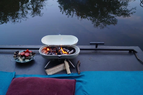 그는 피아노 책상 옆에서 바베큐통을 찾아 냈다. 신발상자 만큼작았다. 나는 배 지붕으로 올라가서 바베큐 뚜겅을 열었다. 숲에서 주운 나뭇가지와 미니 장작을 넣었다. 가스총으로 불을 지폈다. 순식간에 나무에 불이 옮겨 붙었다. 십분 후에 불이 사그라 들고, 숯이 보였다. 그릴을 얹고, 위에 채소를 놓았다. 바닥에 얇은 담요와 요가매트를 깔고 반쯤 누웠다. 맞은편은 잔디밭 멀리 저택이 보였다. 모든 것이 마음에 들었다. 오킬로미터 쯤 옮겼는데, 이웃, 풍경, 주차장, 슈퍼마켓. 주위 환경이 싹 바뀌었다. 존슨이 치즈와 나무 그릇을 들고 올라왔다. 꼭 두부처럼 생겼는데, 원래 구워서 먹는 할루미치즈라고 했다. 그릇에는 밥과 베이비 시금치, 소스가 함께 섞여 있었다.