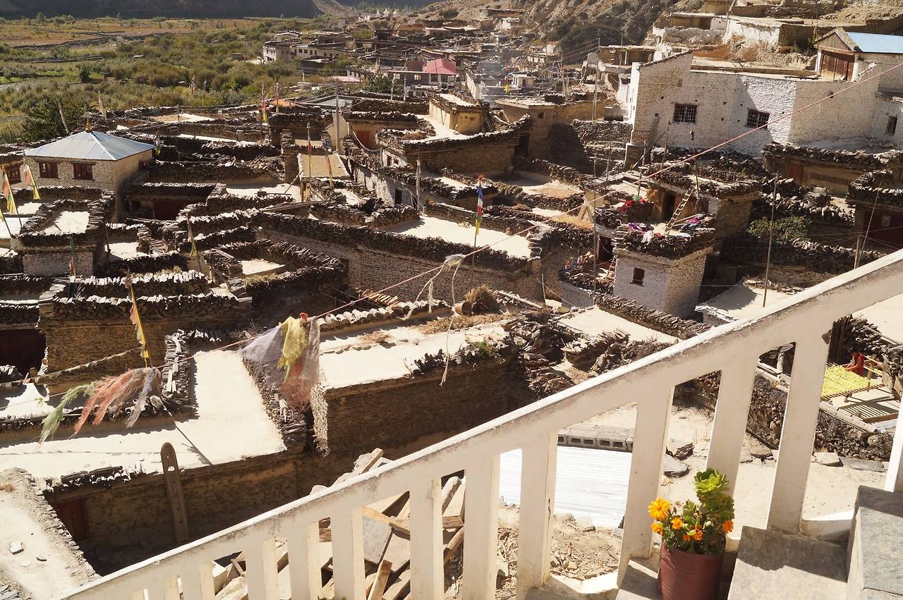 안나푸르나를 시계 반대방향으로 돌고 있는데, 12시는 정상이고, 이 마을은 9시쯤 된다. 11시부터는차, 오토바이 때문에 걷는 일이 꽤 귀찮아졌다. 마파는찻길이 마을을 비껴갔다. 그래서 마을은 작고, 길이 좁아걷기에 안성맞춤이었다. 길과 벽이 우유에 회색 돌가루를조금 뿌린 것 같았다. 산책을 하다 열린 문을 들어가 보니티벳사원이었다. 사원을 보고 나오려는데, 가파른 계단에서 두 명의 승려가나팔을 불었다. 히말라야의 바람에 날리는 나팔 소리, 스님의옷자락. 다음 날, 아침 게스트하우스를 나섰다. 사원을 지나치려다 마지막으로 눈에 또 담고 싶었다. 높은 계단에 서니 마을이 한눈에 보였다.