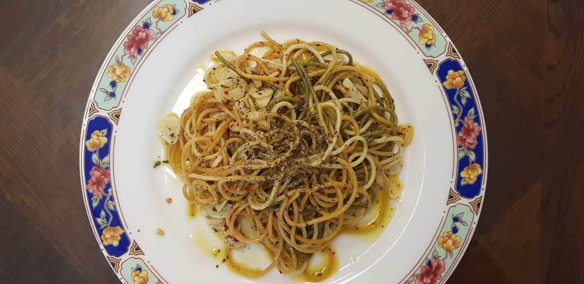 알리오 올리오를 자주 만든다. 마늘(알리오)과 올리브 오일(올리오)만으로 만든 스파게티의 한 종류다. 정식 이름은 알리오 에 올리오Aglio e Olio이고 맵게 만든 것은 알리오 올리오 에 페페론치노이다. 여기에서 에e는 그리고and이다. 페페론치노는 청양고추보다 두세 배 매운 이탈리아 고추다.