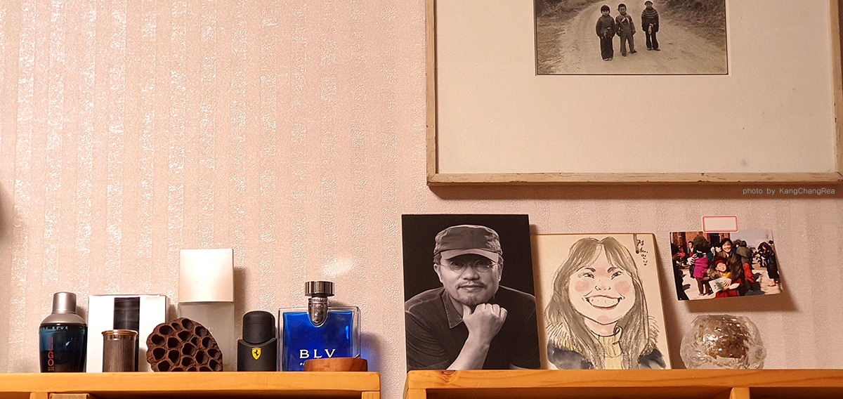 서재 창밖에서는 아름다운 보라색 노을도 다 사위어가고 있었다. 귀가 아플 정도로 집안은 고요했고 어둠이 구석구석 파고들었다. 불을 켜니 낮은 책장 위에 올려져 있는 아내 캐리커처는 함박웃음을 짓고 있었다. 그 옆의 내 사진은 여전히 심각한 표정이었고.