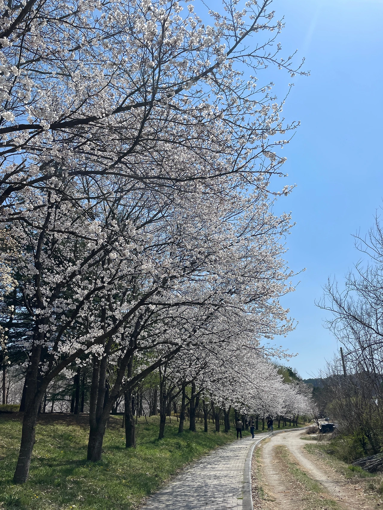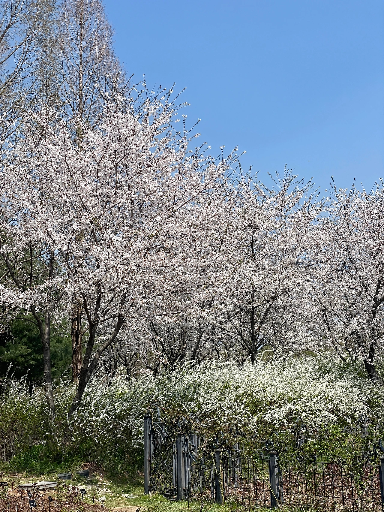 바로 옆이 한림수목원이라 어머님께 한 바퀴 돌고 가시자고 했는데 어머님께서는 걷기 싫다며 너희 둘이 다녀오라고 하셨다. 전시회까지 보고 나온 마당이니 더 이상 걷기가 싫으셨던 것일 수도, 어쩌면 아들 부부내외의 데이트 시간을 마련해주고 싶으셨던 것일 수도 있겠지. 어머님을 두고 가는 것이 마음에 걸렸지만 우리까지 안 간다고 하면 마음 불편해하실까 싶어 얼른 돌아보고 오기로 했다. 어제의 대청호만큼이나 이곳도 봄 꽃들의 향연으로 아름다웠다. 벚꽃뿐 아니라 조팝꽃에 겹벚꽃, 수선화까지 잘 조성해 둔 꽃밭을 부지런히 눈에 담으며 이 시기에 대전에 온 것이 행운처럼 느껴졌다. 어머님을 위해 온 여행이었는데 오히려 우리가 좋은 구경을 실컷 했다.