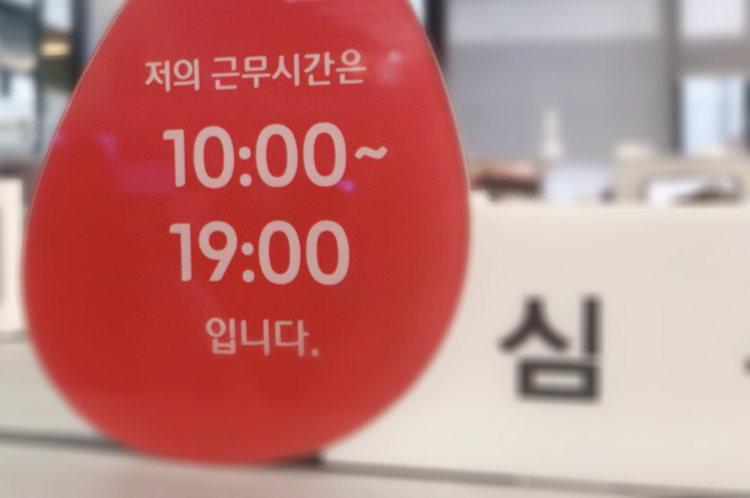 육아휴직이 끝나갈 즈음, 복직 면담을 위해 회사에 왔다. 팀장님 면담을 마치고 오랜만에 팀분들을 보기 위해 사무실로 올라왔다. 내 눈에 가장 먼저 띈 건, 개별 책상의 명패 위에 붙은 빨간딱지. 각자의 출근시간을 표시하는 팻말이다. 8시 출근 5시 퇴근부터, 10시 출근 7시 퇴근까지 다양한 시간대가 써져있었다. 한번 정한 출퇴근 시간은 한 달 동안 이어지며, 매달 근무시간 계획을 제출하면 된단다.