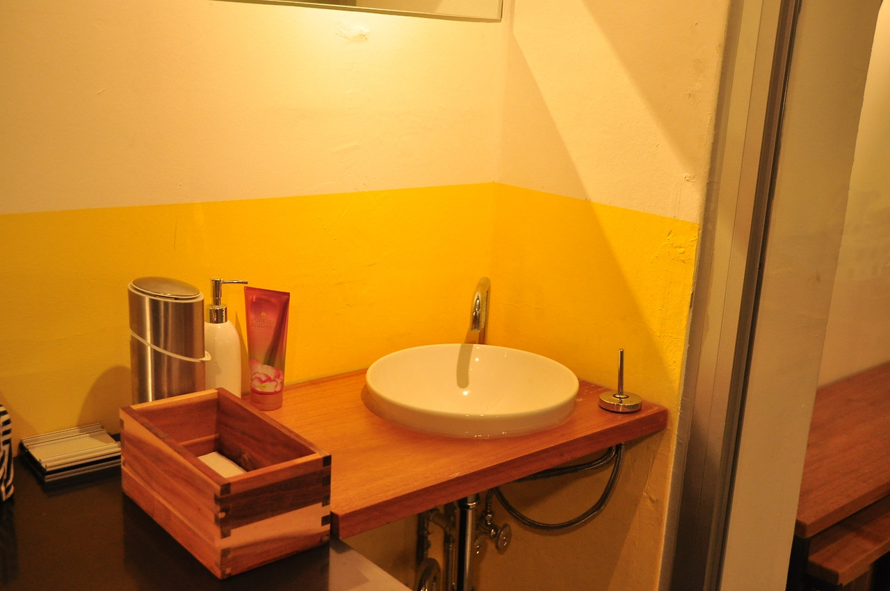 나는 기본적으로 뭐든 노출을 좋아하는 편이다. 미관상 가리기 위해 마감처리를 어정쩡하게 하는 작업도 에너지가 많이 들기는 하지만 혹여 나중에 보수를 해야하는 상황이 왔을 때 난감한 일들이 더 많이 발생 한다는 것을 예전 공사 경험을 통해서 이미 터득했기 때문이다. 그래서 이쪽 손 씻는 공간도 별것 없이 나무에 심플한 도기 (당시 사오만원 주고 샀던것 같다)를 얹고 수전에 더 신경을 쓰는 정도? 핸드타월 두는 나무는 이케아 제품 이었던 것 같다. 그렇게 우리 공간의 직접 공사는 시작이 되었다.