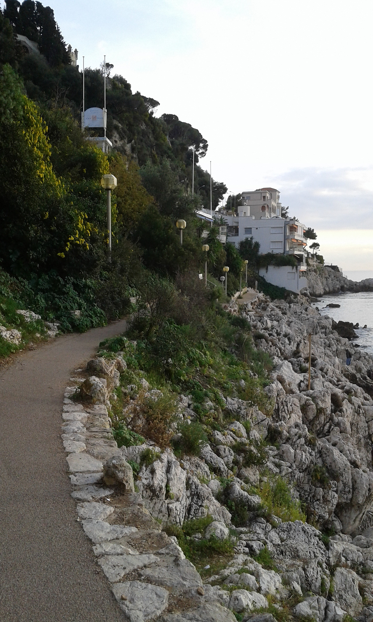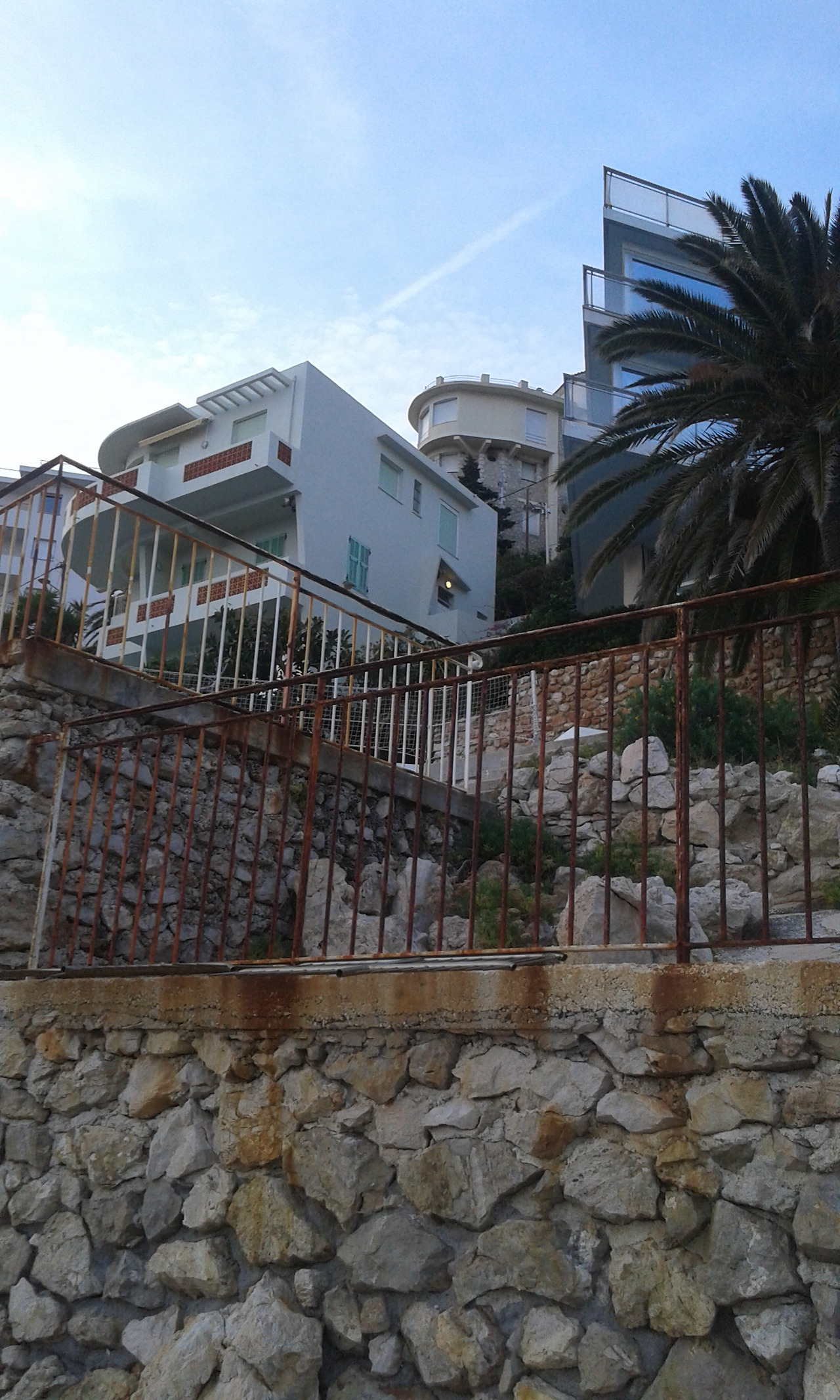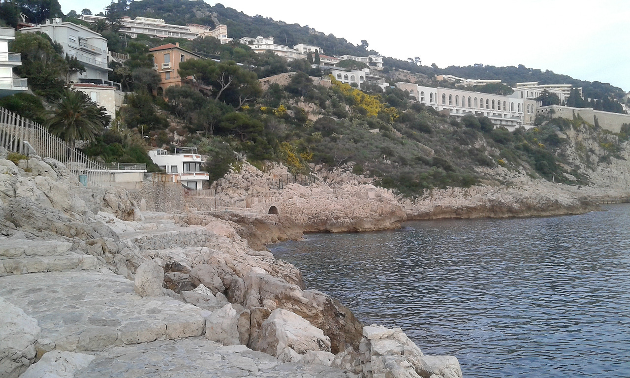 위에 건물은 le Palais Maeterlinck 궁 레지던스형의 별장이다. Maurice Maeterlinck [1862-1949] 시인이고 극작가였다. 이 작가가 이 궁을 매입한 과거사가 있고 네오 클래식의 스타일의 건축물의 스토리가 있다. 그리고 니스 시청에서 이 작가의 이름을 따 Boulevard Maurice Maeterlinck [모리스 맥테르맄 거리]로 도로 명칭을 지었다. 예전에 호텔이었는데 지금은 체코 출신의 억만장자가 럭셔리한 약 30개의 아파트 레지던스 별장으로 경영하고 있다. 별장 주인들은 가파른 땅, 지리로 해변을 에스카 레이터형의 교통수단으로 나들이하겠지 싶다. 나아가야 하는 길은 개인 소유일 수가 없다. 모두의 것이다... 그리하여 억만장자들의 건축물로 뒷배경으로 장식된 이 해변길을 모두가 걸을 수 있다. 한다.