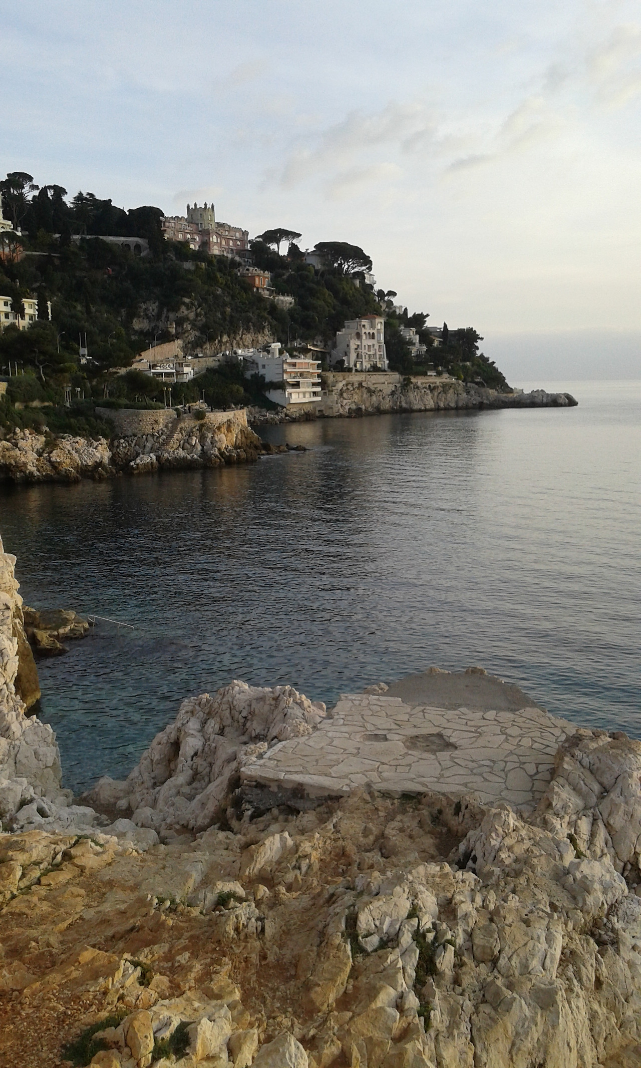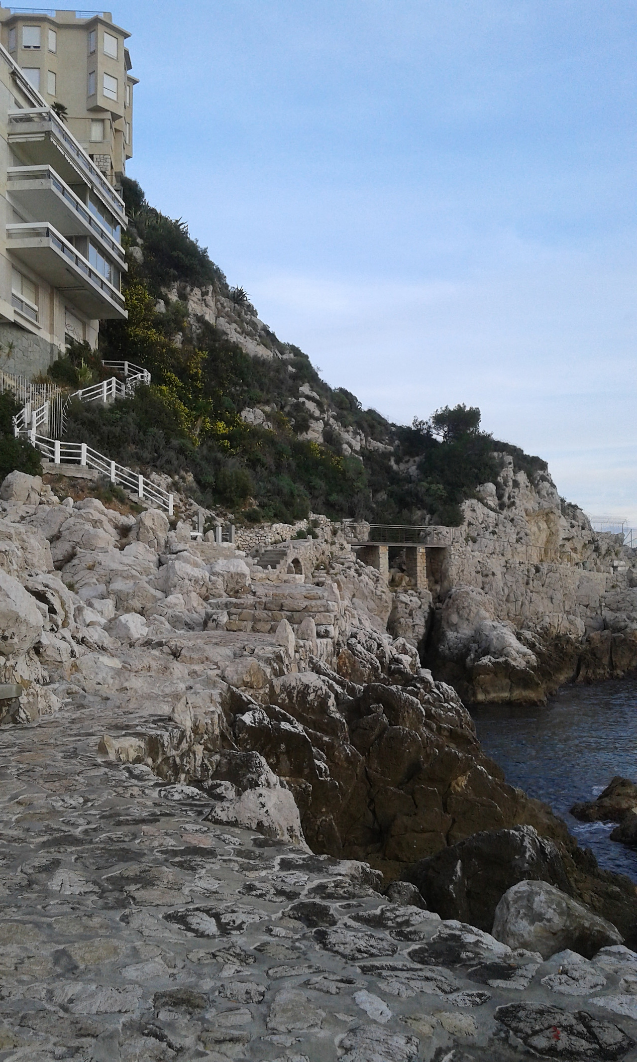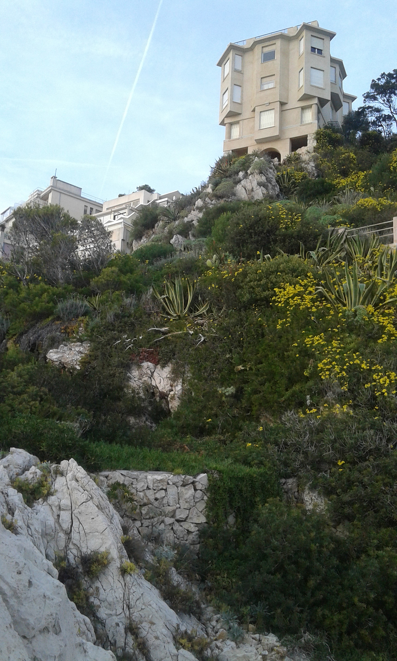 위에 건물은 le Palais Maeterlinck 궁 레지던스형의 별장이다. Maurice Maeterlinck [1862-1949] 시인이고 극작가였다. 이 작가가 이 궁을 매입한 과거사가 있고 네오 클래식의 스타일의 건축물의 스토리가 있다. 그리고 니스 시청에서 이 작가의 이름을 따 Boulevard Maurice Maeterlinck [모리스 맥테르맄 거리]로 도로 명칭을 지었다. 예전에 호텔이었는데 지금은 체코 출신의 억만장자가 럭셔리한 약 30개의 아파트 레지던스 별장으로 경영하고 있다. 별장 주인들은 가파른 땅, 지리로 해변을 에스카 레이터형의 교통수단으로 나들이하겠지 싶다. 나아가야 하는 길은 개인 소유일 수가 없다. 모두의 것이다... 그리하여 억만장자들의 건축물로 뒷배경으로 장식된 이 해변길을 모두가 걸을 수 있다. 한다.