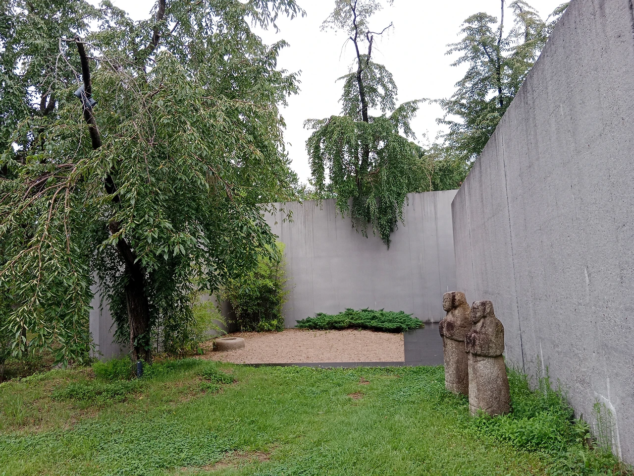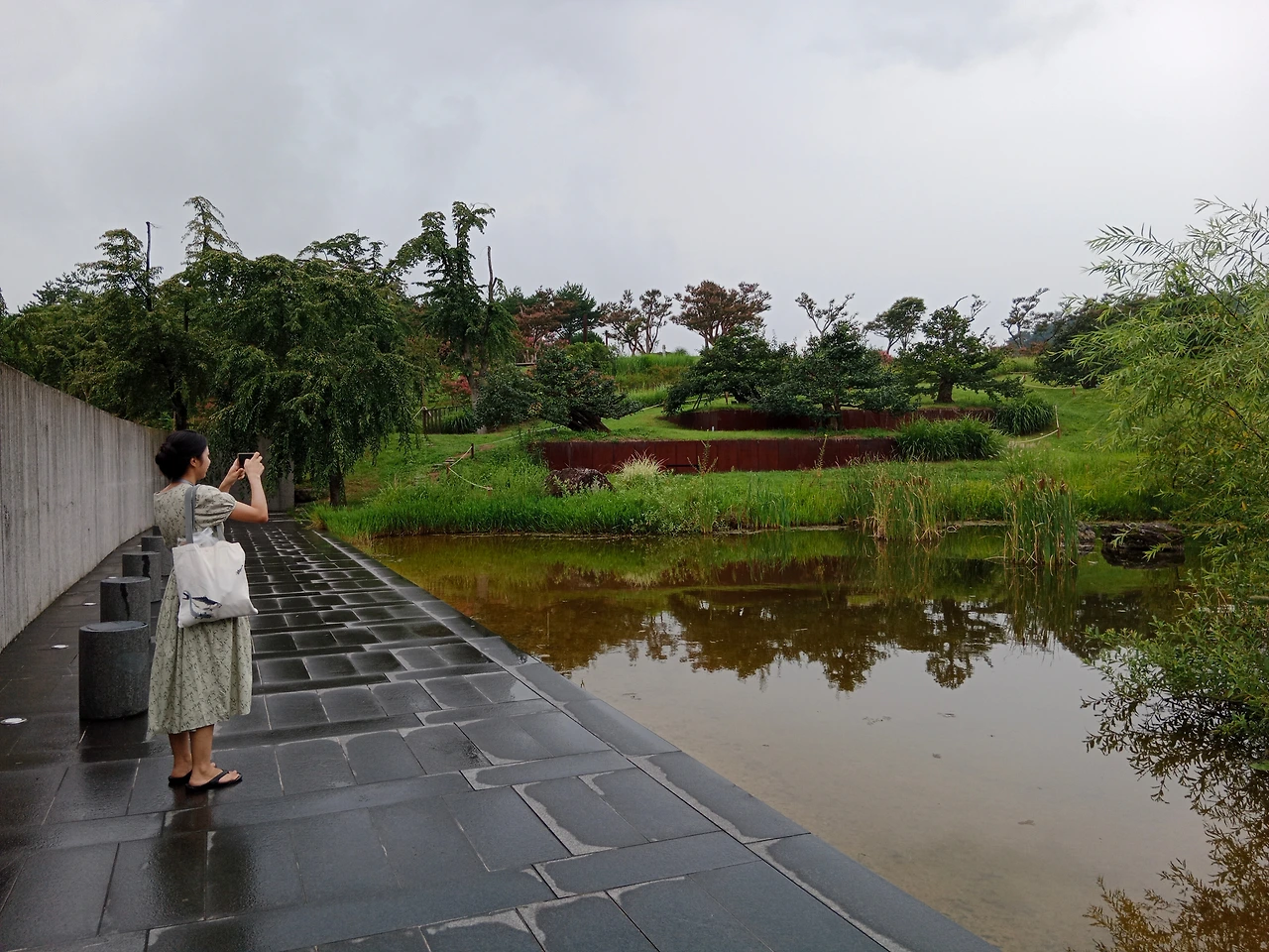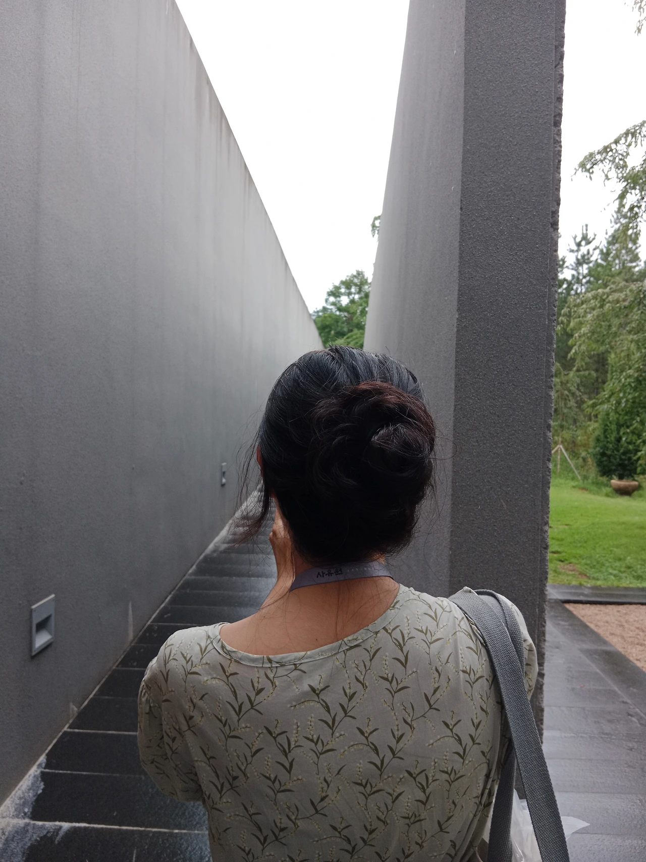 풍설기 천년, 정원 입구엔 든든하게 다정한 두 석상이 [부부?] 우리를 맞이 했고 풍경을 가리는 역할을 하는 높은 콘크리스 벽이 길을 안내한다. 길은 좁은 폭으로 홀로 걷다 보면 자신의 심장 소리가 들릴 듯, 나에게 집중하게 된다. 그러더니, 한 곳의 이런 몰입감이 벽길을 나와 발견되는 모과나무 풍경에 내 안의 감정들이 불꽃처럼 사방으로 발산하게 되더이다.. 다 계획이 있는 구성이었구나... 뒤를 보니, 벽. 내가 서 있는 바닥은 무대가 되고 풍광을 담고 있는 연못은 또 다른 우주를 넘나들게 하고... 얼 털털 심장이 뛰더이다.