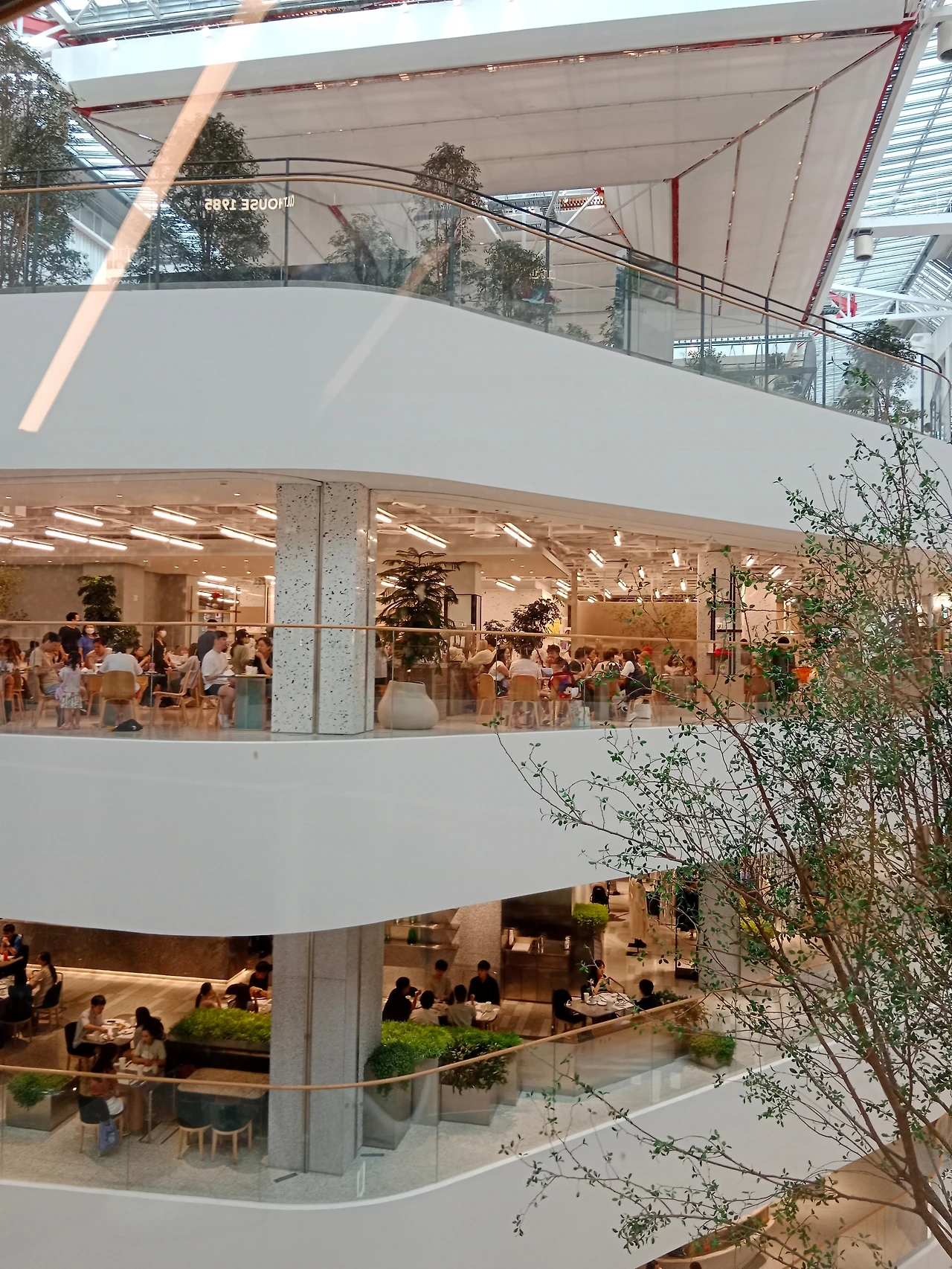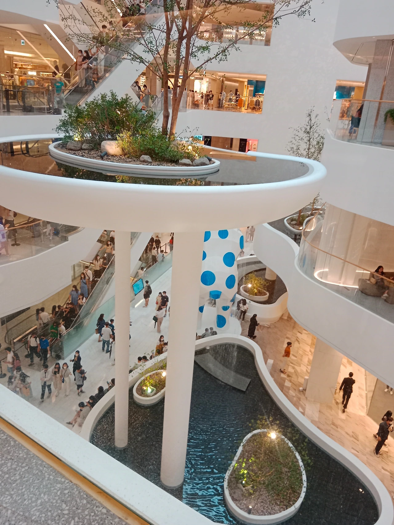 건물 안은 중앙 부분에 실내정원을 곡선으로 공중에 떠 있는 연출이라 가상공간에 와 있는 기분이랄까, 또는 층 트임으로 크루즈 여행자가 된 착각이 들기도 한다. 세계 유명 브랜드를 집합시켜 놓은 곳, 요즘 트렌드 한 게 뭐야? 젊은 세대는 뭐에 훅해? 어떻게 쇼핑해? 란 질문에 좀 이해를 하고 온 날이다.