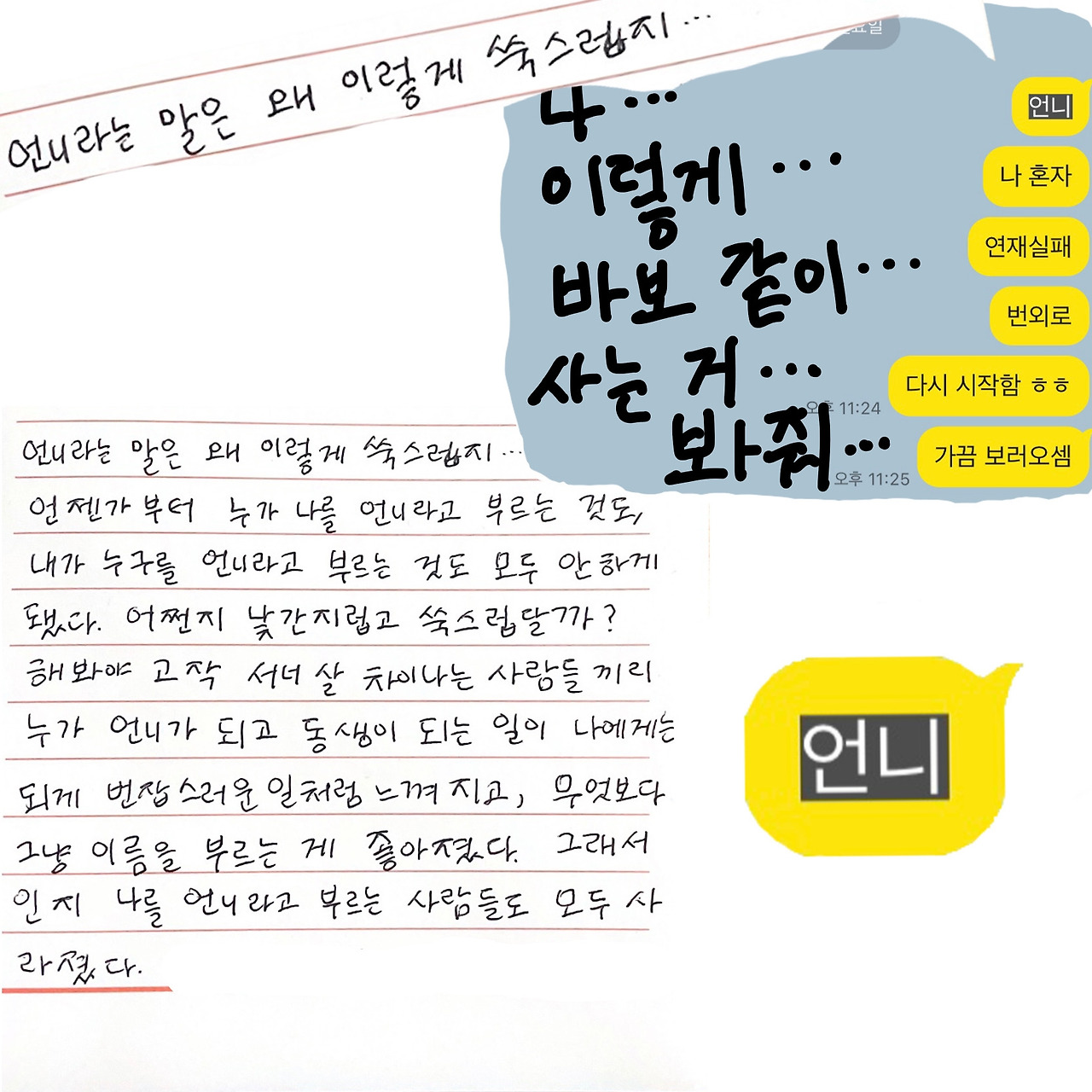 대학에 다닐 때 후배 몇 명이 날 언니라고 부르며 종종 연락했었는데 그때 나는 동생들을 대하는 게 너무 어려워 끝까지 말을 놓지 못 했다. 친해지지도 못 했고 해줄 말도 없었다. 지금 생각해보면 친구로 대하면 될 것을 언니 노릇을 하려니 어려웠떤 것 같다. 그런 내가 언니라는 말을 자주 쓸 때도 있다(1) 그건 바로 유튜브에서 댓글을 달 때. 나보다 나이가 많은 유튜버들(실은 나이 상관없이 멋있을 때)에게는 '언니'라는 소리가 절로 나온다. '사랑해요'와 함께. '언니 귀여워요.', '언니 사랑해요.'로 댓글 범벅을 해도 그 땐 '언니'라는 말이 하나도 쑥스럽지 않다. 나랑 머나먼 사이 같아서 그런가. 아무튼.