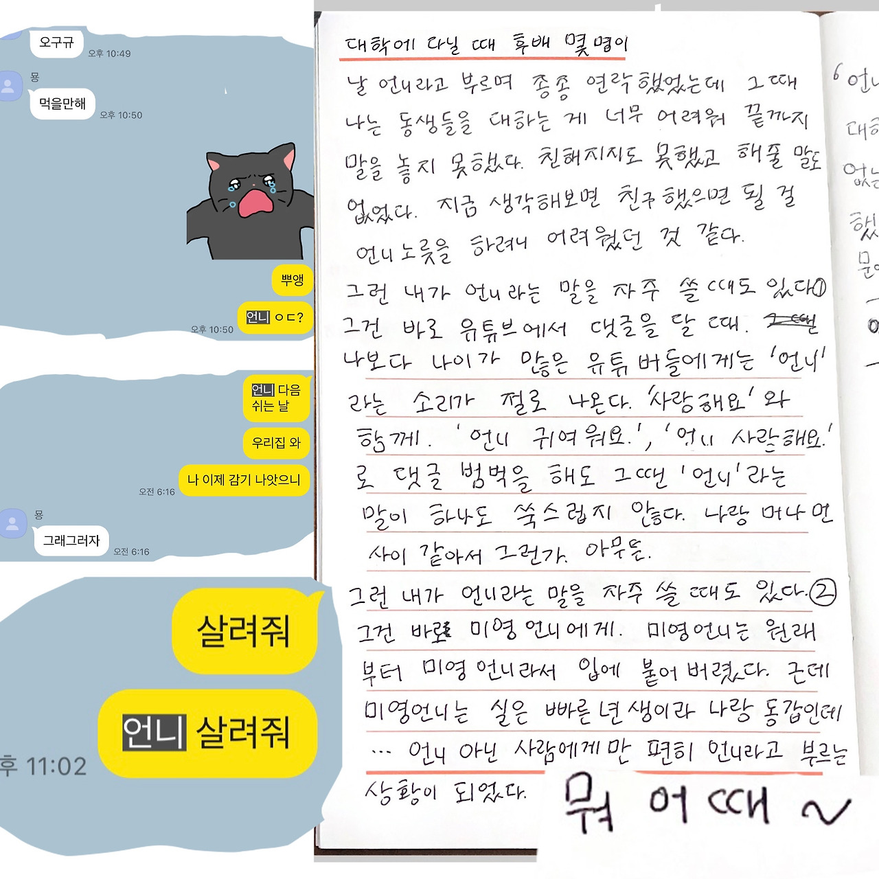 그런 내가 언니라는 말을 자주 쓸 때도 있다(2) 그건 바로 미영언니에게. 미영언니는 원래부터 미영언니라서 입에 붙어버렸다. 근데 미영언니는 실은 빠른 년생이라 나랑 동갑인데……. 언니 아닌 사람에게만 편히 언니라고 부르는 상황이 되었다. 뭐 어때~