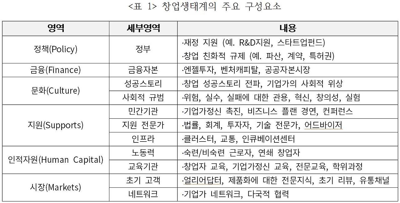 생태계(ecosystem)는 상호 작용하는 물리적 환경의 측면과 서식지를 차지하는 유기체의 체계로 정의되는 생물학적 용어이지만, 1990년 이후 경제학 분야에서 사용되었고 Isenberg(2010)는 창업생태계(entrepreneurship ecosystem)라는 용어를 사용하기 시작하였다. 창업생태계는 정책(policy), 금융(finance), 문화(culture), 지원(supports), 인적자원(human capital), 시장(market) 등 6가지 요소로 구성되어 있고, 이들 간의 상호작용을 전제로 한다.