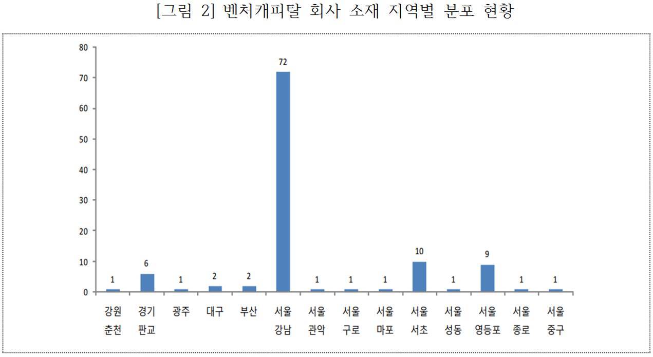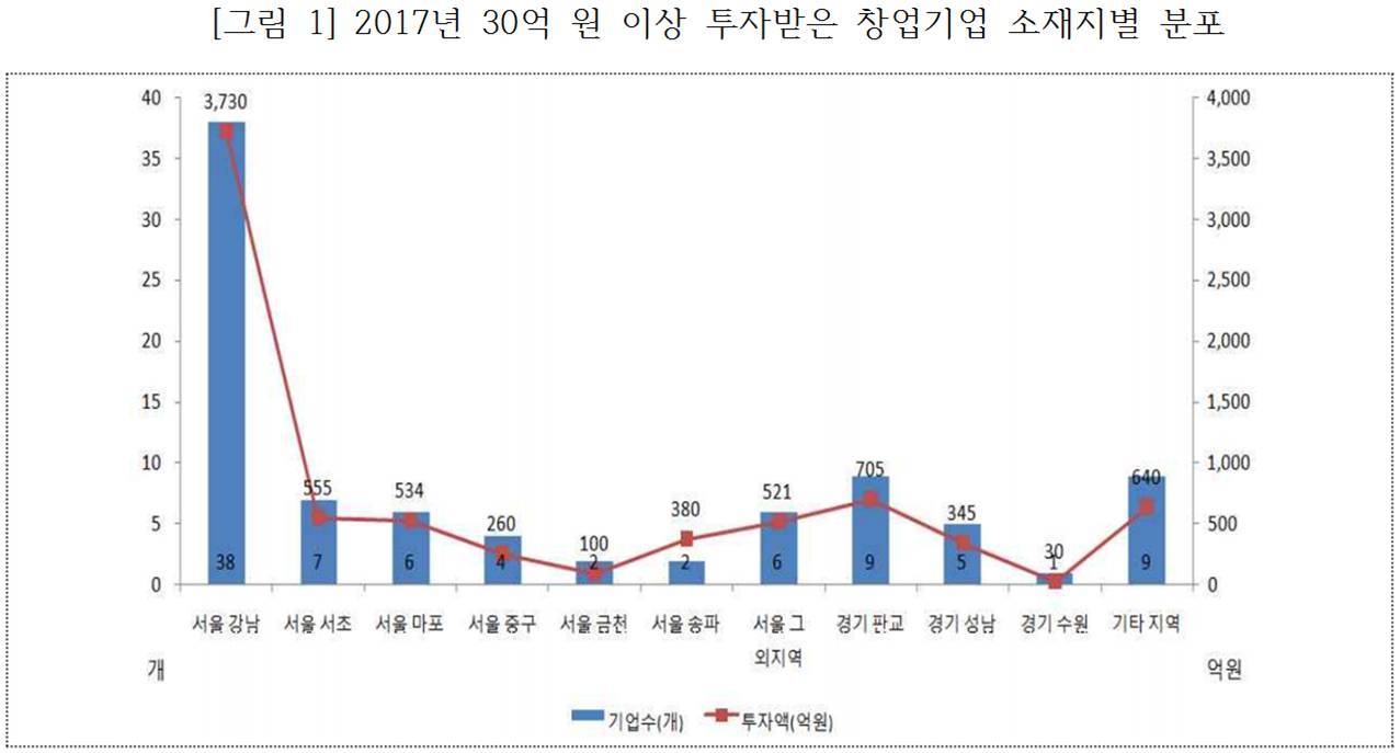 창업 자금조달에서 중요한 역할을 하는 벤처캐피탈은 서울 강남에 집중되어 있다. 벤처캐피탈협회에 등록된 벤처캐피탈 회사 109개사 중 판교에 소재한 벤처캐피탈은 6개사(5.5%)에 불과하다. 물론, 판교와 서울 강남과의 접근성이 나쁘지 않아 판교의 부족한 벤처캐피탈을 보완할 수 있지만, 서울과 비교하면 판교의 벤처캐피탈 접근성은 크게 떨어진다고 할 수 있다. 2017년 30억 이상 투자받은 창업기업 전체 91개사 중 서울 강남 소재 기업은 38개(3,730억)로 가장 많았고, 판교 소재 기업은 9개(705억)로 나타났다. 서울 강남 및 판교에 이어 서울 서초(7개 기업, 555억), 서울 마포(6개 기업, 534억) 순으로 나타나, 서울의 창업기업이 강세를 보이고 있고, 조성된 지 얼마 되지 않은 점을 감안하면 제1판교는 빠르게 성장하는 창업생태계라는 것을 알 수 있다.
