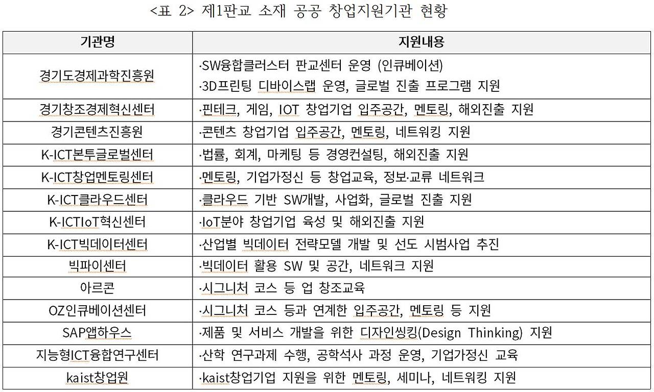 최근 IT, BT 첨단기업이 모여 있는 곳이자 새로운 창업 도시로 많은 관심과 기대를 받고 있는 제1판교테크노밸리(이하 제1판교)는 경기도가 기획, 조성한 곳으로 2015년 조성이 완료된 이후 우리나라를 대표하는 첨단산업 클러스터로 1,300개사가 집적해 있고, 종사자수도 7만 4천 명에 이르며, 매출액 기준 상위 게임업체 6개사와 SK, 포스코 등 대기업 첨단업종 계열사가 입주해 있다. 판교를 대표하는 창업공간인 스타트업캠퍼스에는 스타트업과 이를 지원하는 공공 및 민간기관이 다수 입주해 있다.