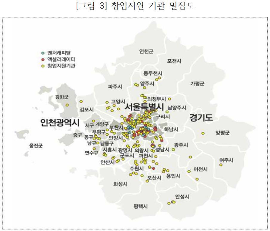 2017 글로벌 창업백서(본투글로벌)의 창업지원기관 분포 현황을 보면, 벤처캐피탈, 엑셀러레이터, 창업지원기관은 서울에 집중되어 있고, 경기도의 경우 성남에 집중되어 있는 것을 알 수 있다.