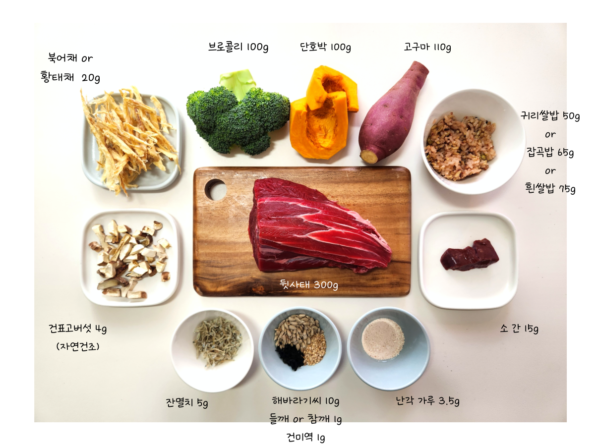 집에서 흔히 볼 수 있는 한식재료와 조금은 낯설지만 개에게 알맞은 재료들을 잘 조합하면, 신선하고 건강한 반려견 집 밥을 만들 수 있어요.