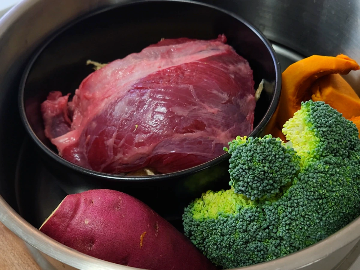 물이 팔팔 끓는 시점부터 브로콜리, 단호박은 3-5분, 고구마는 12분, 고기는 20분.