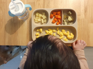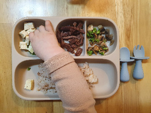 스스로 집어 먹을 수 있도록 작게 잘린 핑거 푸드를 줍니다.