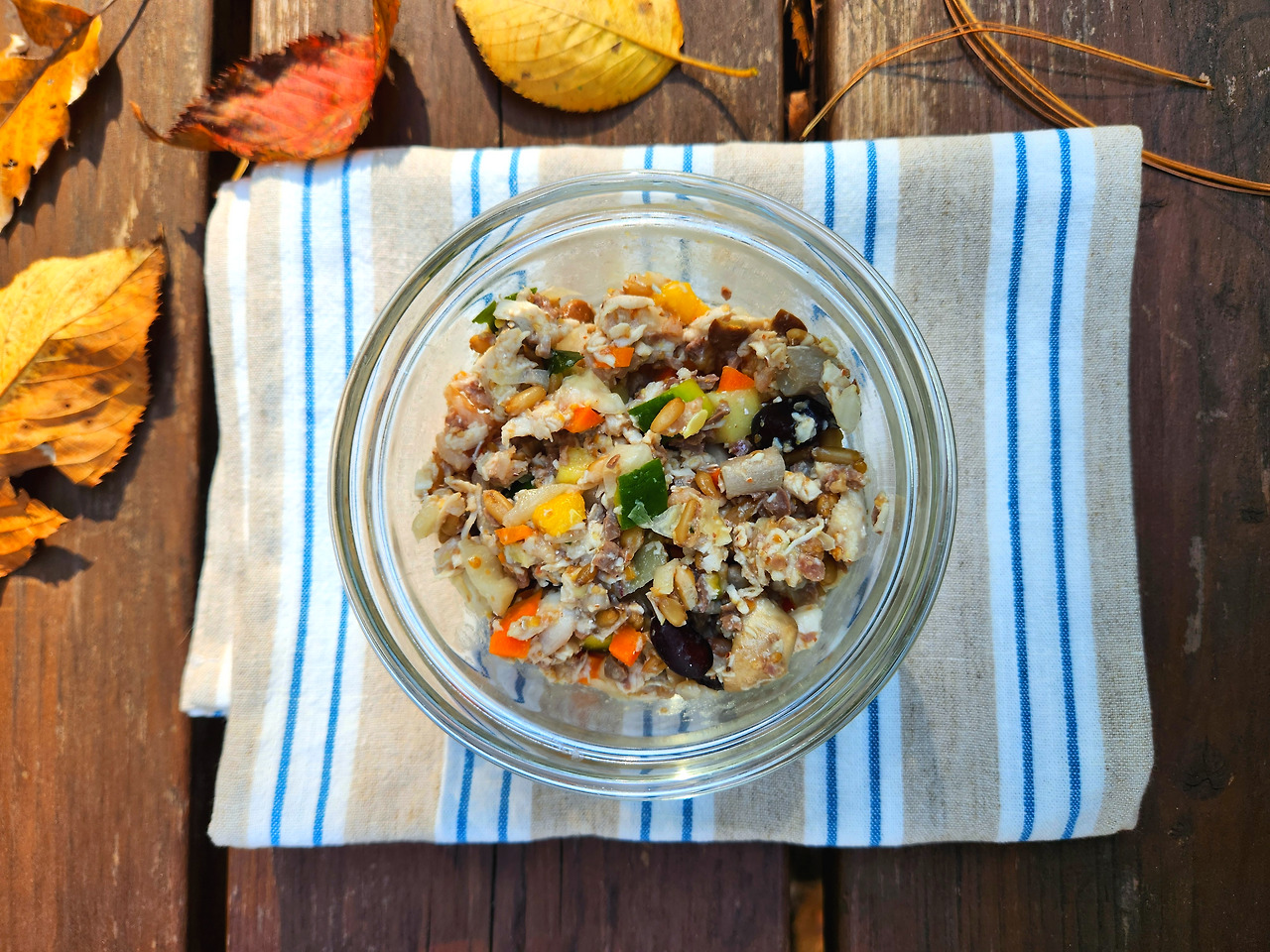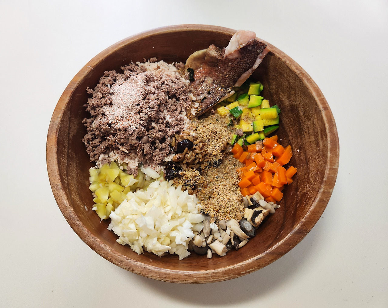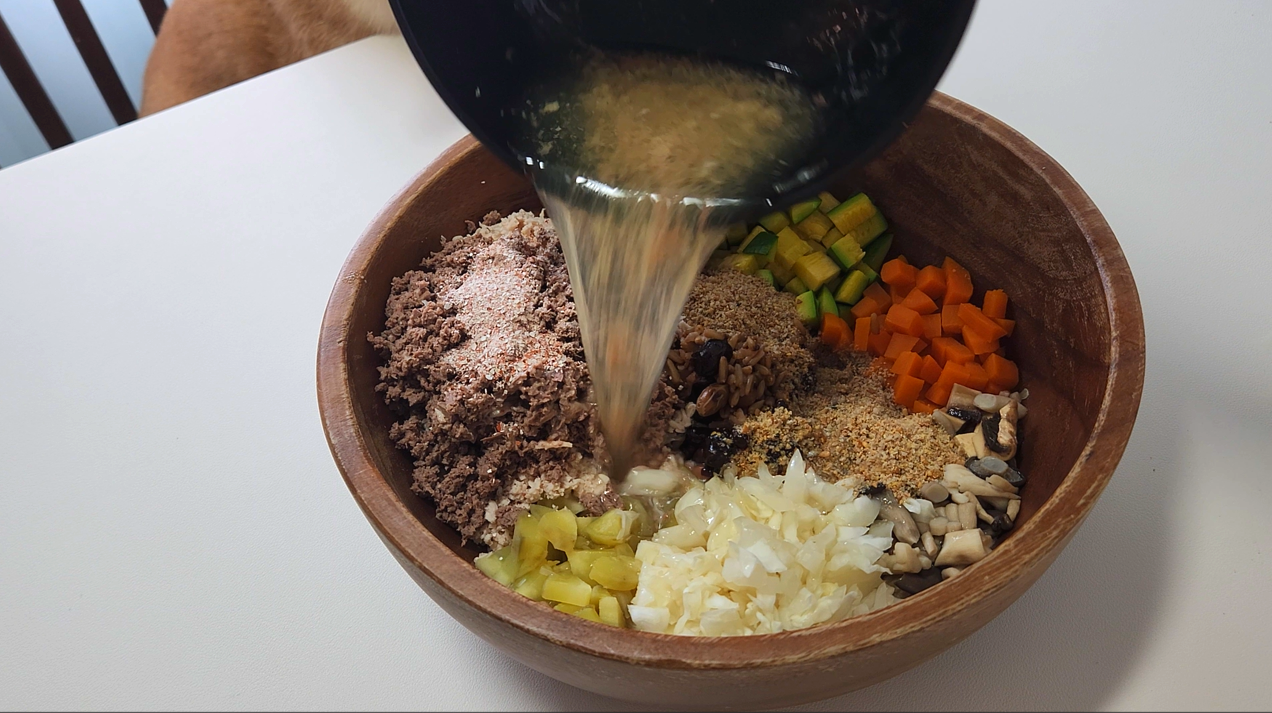 이제 준비된 모든 재료를 골고루 섞어주면 끝! 원하는 분량으로 소분하거나, 급여 스케줄에 따라 냉장이나 냉동 보관해요. 호두는 2-3일 내 먹을 분량이니 냉장 보관하고요.