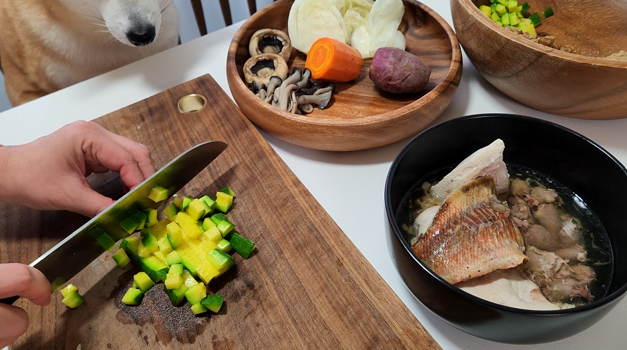 식재료를 이것저것 준비하다 보면 재료비가 많이 나올 것 같지만, g당 식재료 비용을 합산해서 시판 화식 사료와 단가를 비교해 보면 꽤나 경제적입니다. 무엇보다 원재료의 품질과 댕댕이 취향, 건강 상황에 맞춘 재료를 고를 수 있다는 점, 갓 지은 신선한 집 밥을 제공한다는 점이 '반려견 집 밥 만들기'의 가장 큰 매력이지요.