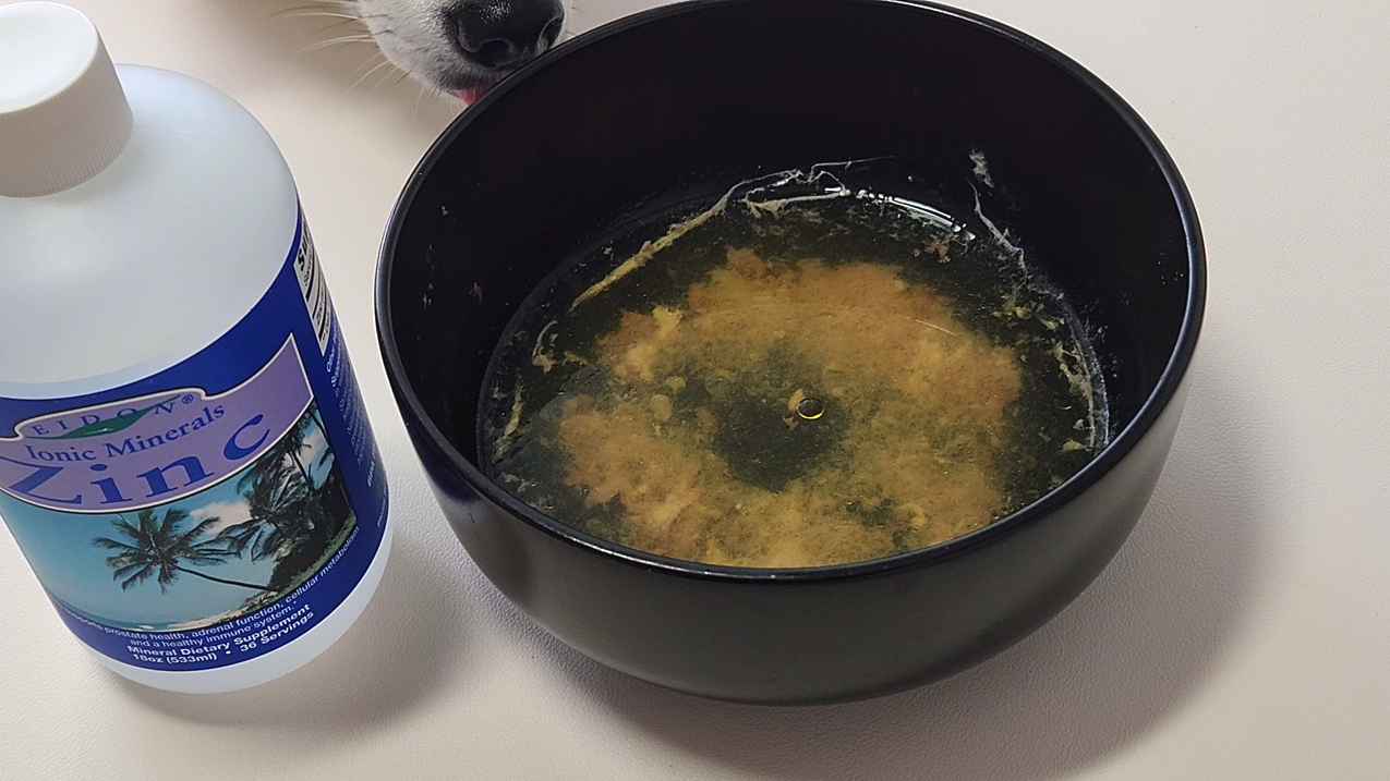모든 재료를 갈아도 좋고, 썰어도 좋고 집사 마음 가는 대로 손질 아연 20ml(10mg), 비타민 E 1 drop(10mg)를 육수에 섞어서 뿌려주고요