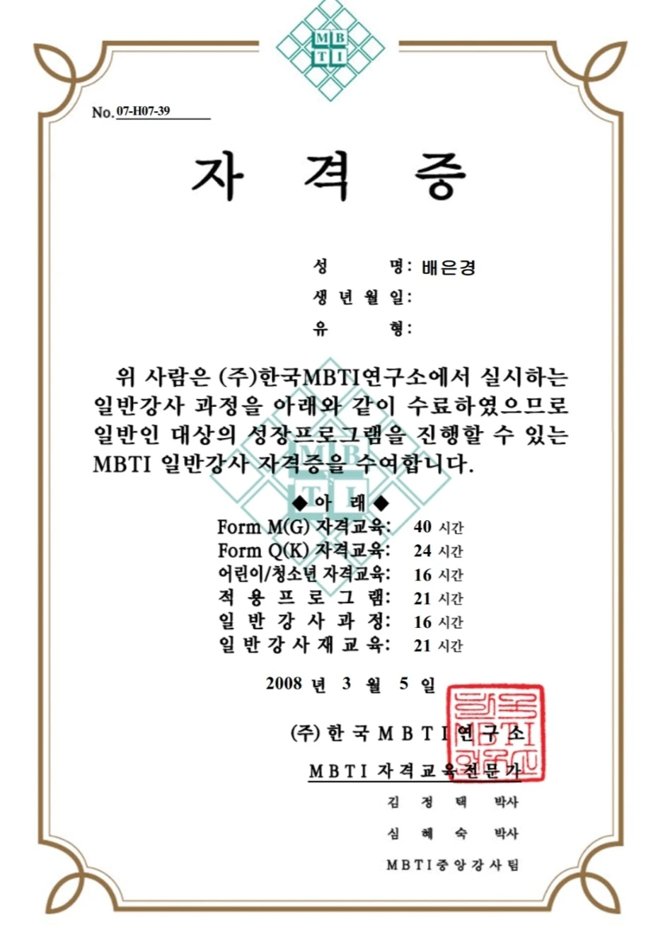 MBTI 검사를 하고 유형만 알고 지내다가 MBTI 전문자격 공부를 시작했다. 초급과정을 2006년 1월 17일 수료를 시작으로 2008년 3월 5일 과제물이 통과되고 전문강사 자격을 취득했다.