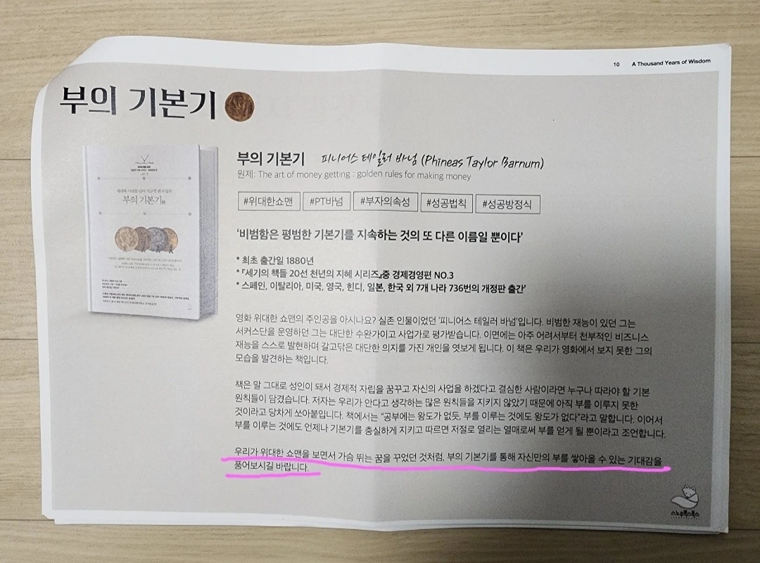 이 책 《 부의 기본기 》는 100만부도 아닌 1000만부 이상 판매된 책이라는 것이 매우 끌리게 했다. 심지어 지은이도 우리가 흔히 알고 있는 영화 '위대한 쇼맨' 의 모델인 "피어니스 테일러 바넘"님이시다. "피어니스 테일러 바넘"님은 당시에 없던 창조적인 기획으로 이미 8살때부터 자신의 사업을 시작한 인물이라는 점도 매우 놀라웠다. "피어니스 테일러 바넘"님을 대단한 부자로 만들어 준 인생의 황금기가 서커스단을 설립한 이후였기 때문에 이 분을 쇼맨으로 기억하기 쉽지만, 이 분의 전 생애를 살펴보면 이 분의 삶 전체가 황금기였던거 같다고 합니다. 이어서 '부'를 이루는 것에도 언제나 기본기를 충실하게 지키고 따르면 저절로 열리는 열매로써 부를 얻게 될 뿐이라고 조언했다고 합니다.