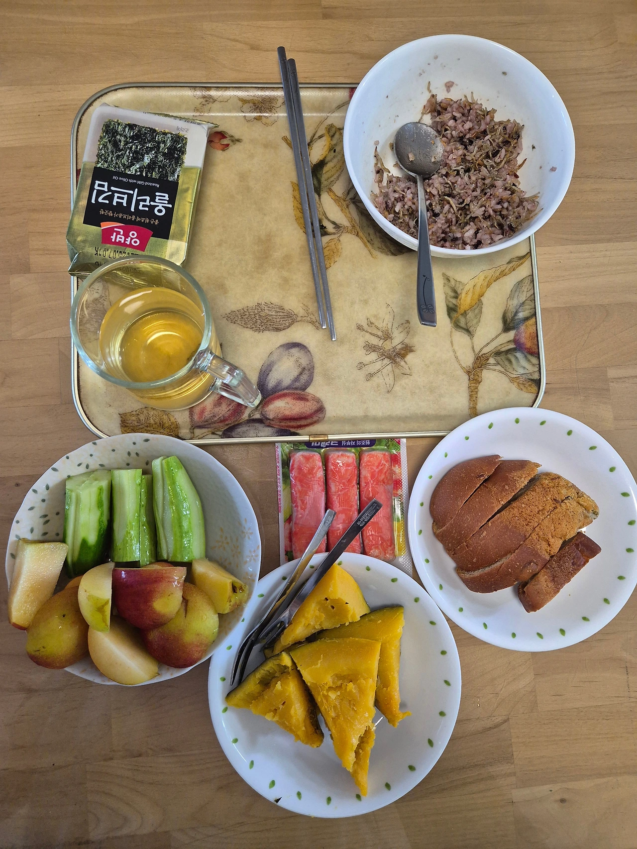 우리는 어제 먹고 남은 빵과 단호박, 오이, 자두, 크래미 등등 이것저것