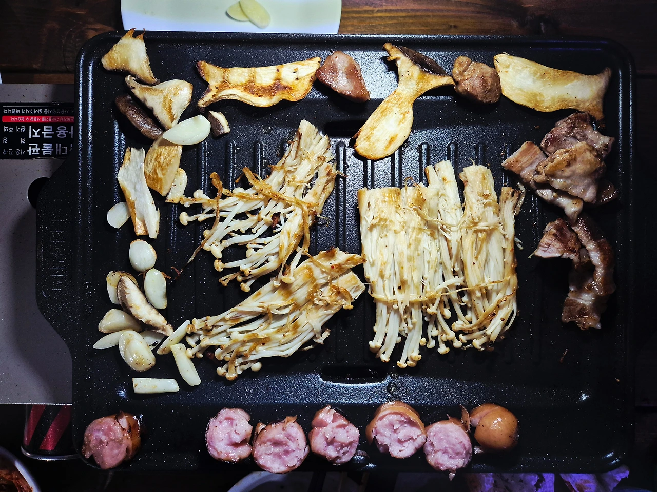 곁들인 친구들: 새송이와 팽이버섯, 마늘, 상추와 깻잎, 소시지